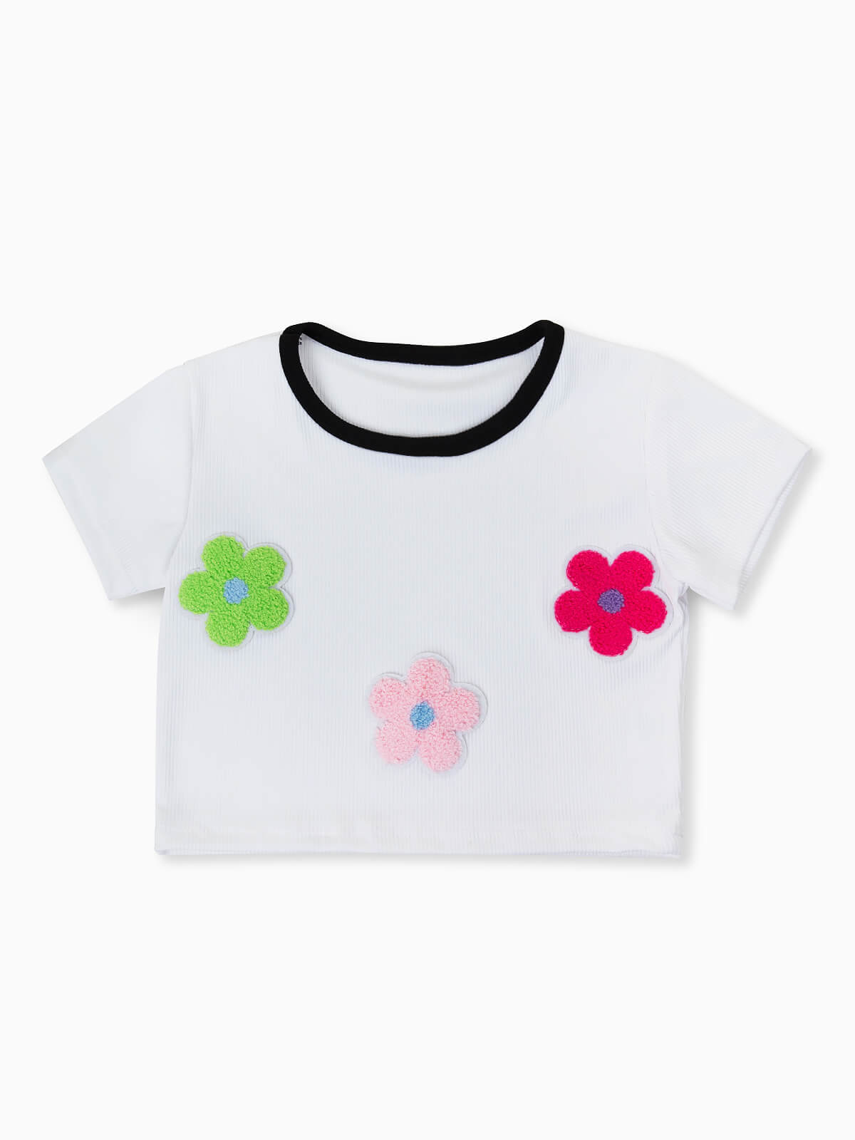 T-shirt cropped branca de manga curta para menina. T-shirt em malha canelada com decote redondo. Flores coloridas em tecido terrycloth.