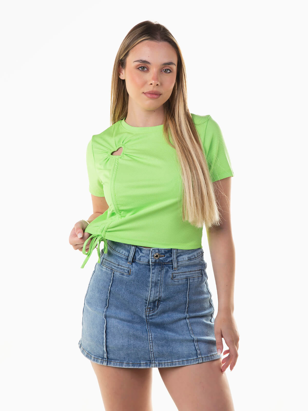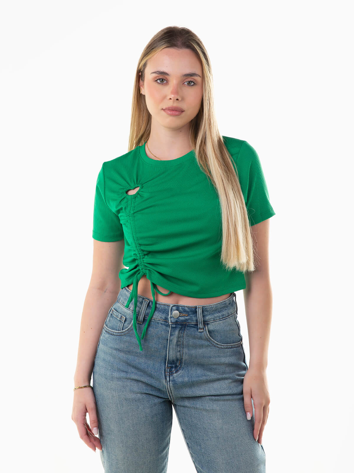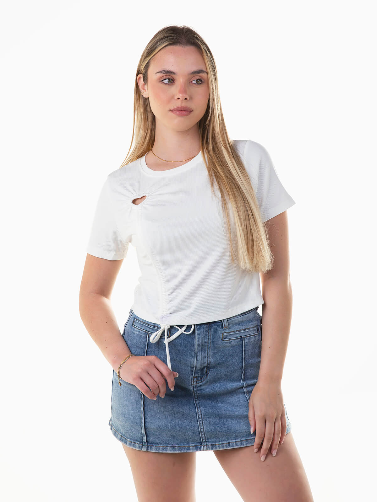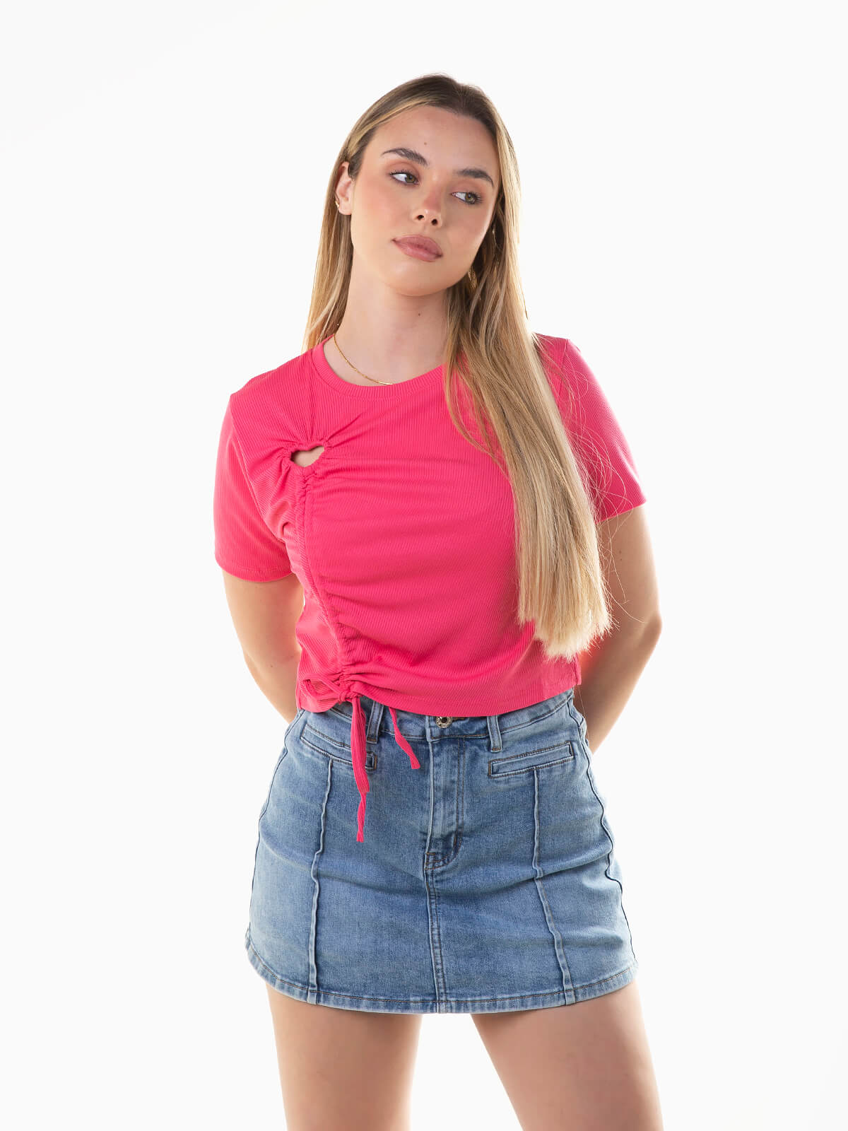 T-shirt cropped canelada com coração recortado no peito e cordões para efeito franzido. T-shirt manga curta para mulher com decote redondo.