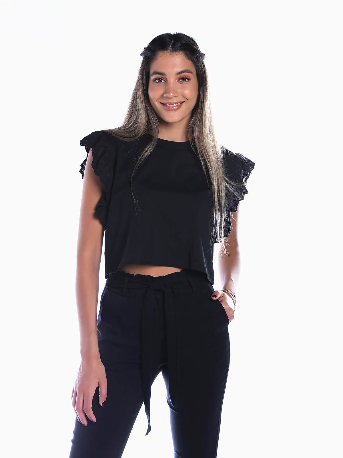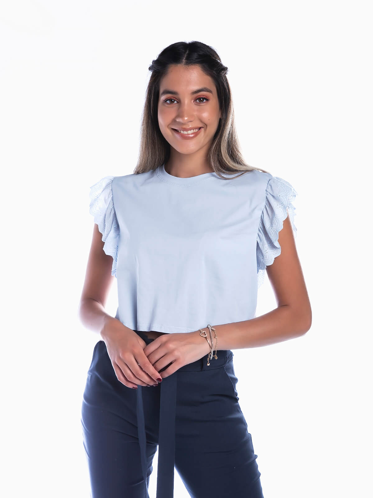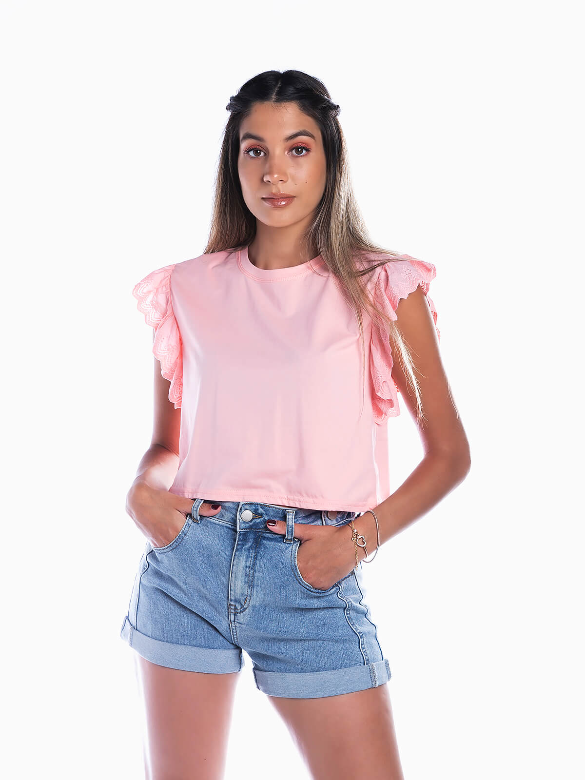 T-shirt cropped com mangas em tecido bordado inglês aplicadas na cava. T-shirt com gola redonda.