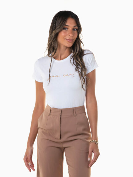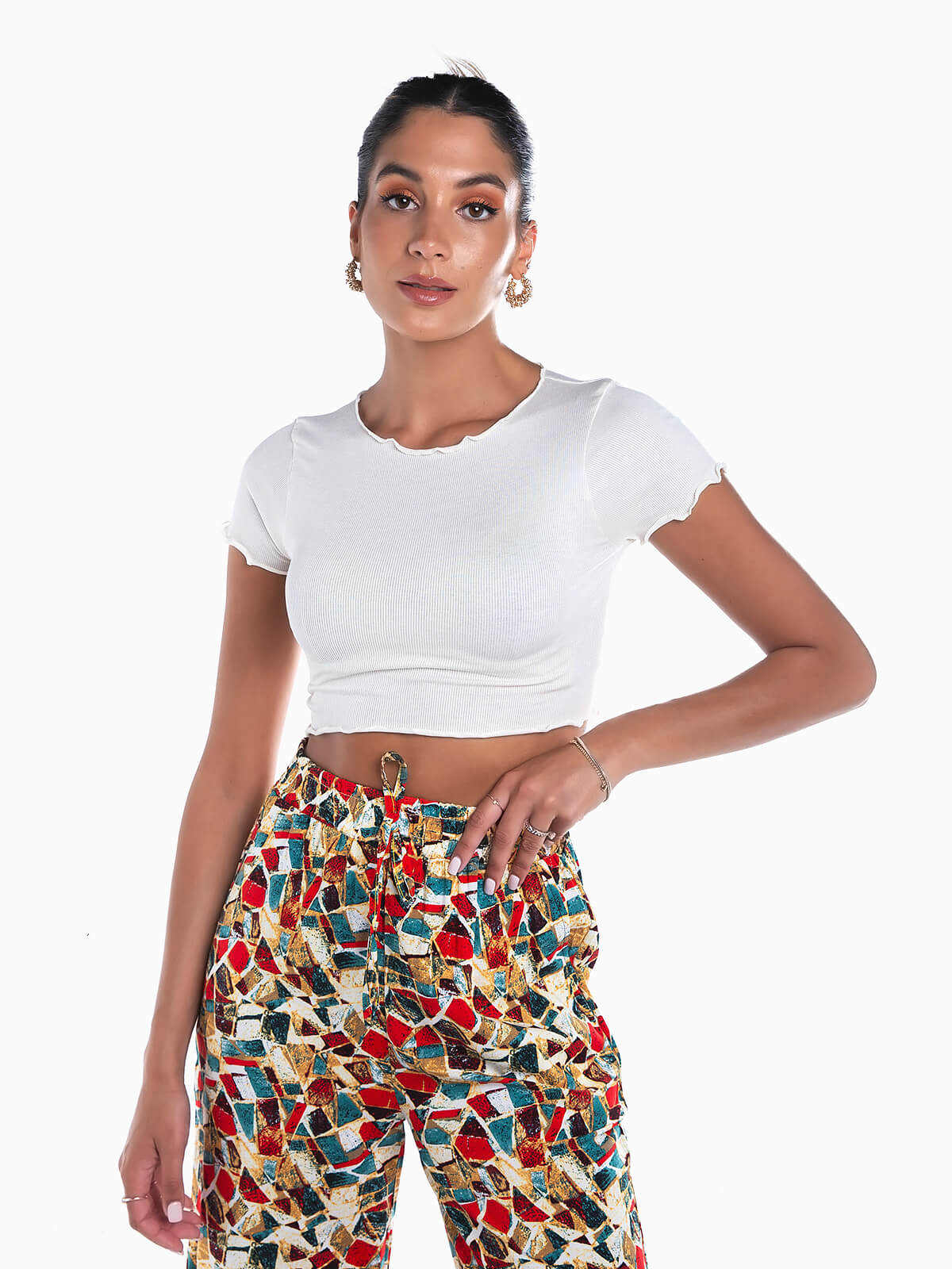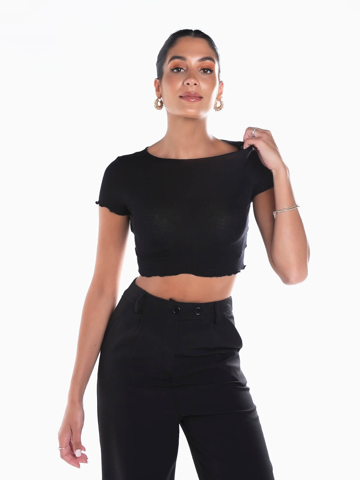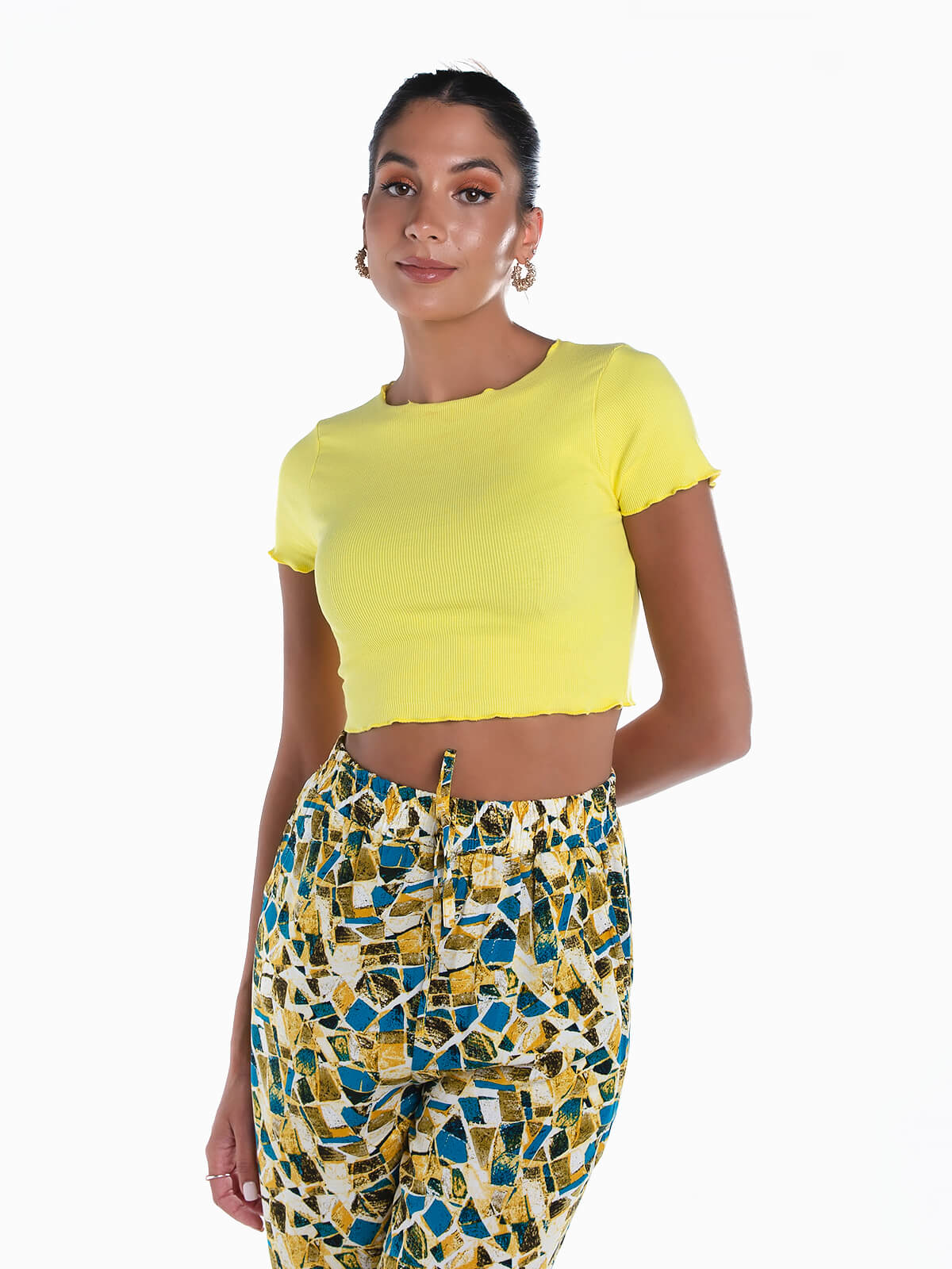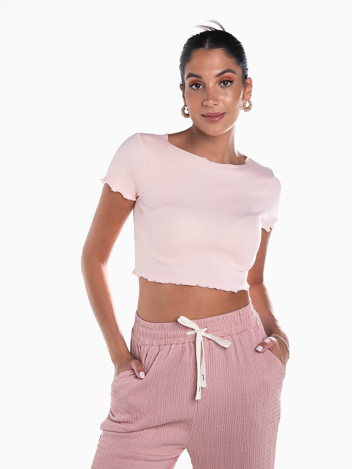 T-shirt cropped de manga curta para senhora. T-shirt em malha canelada com decote redondo. Acabamento de rolinho.