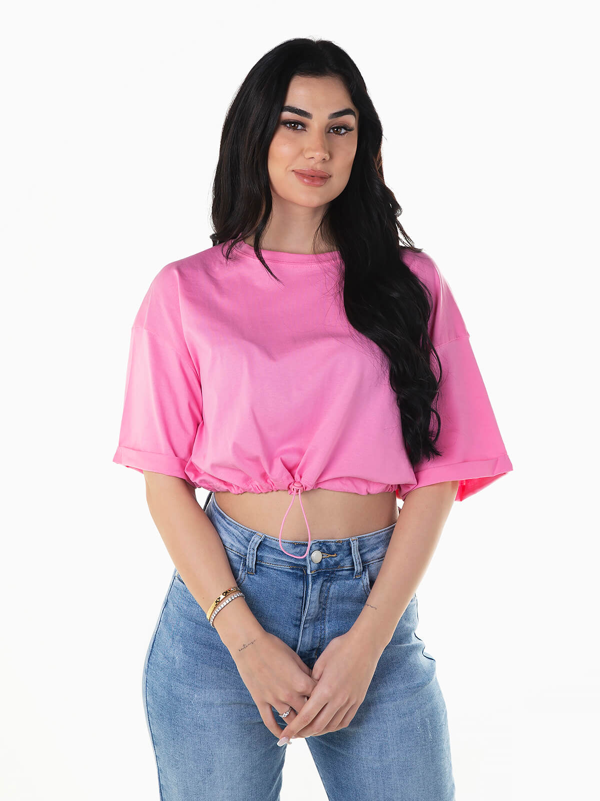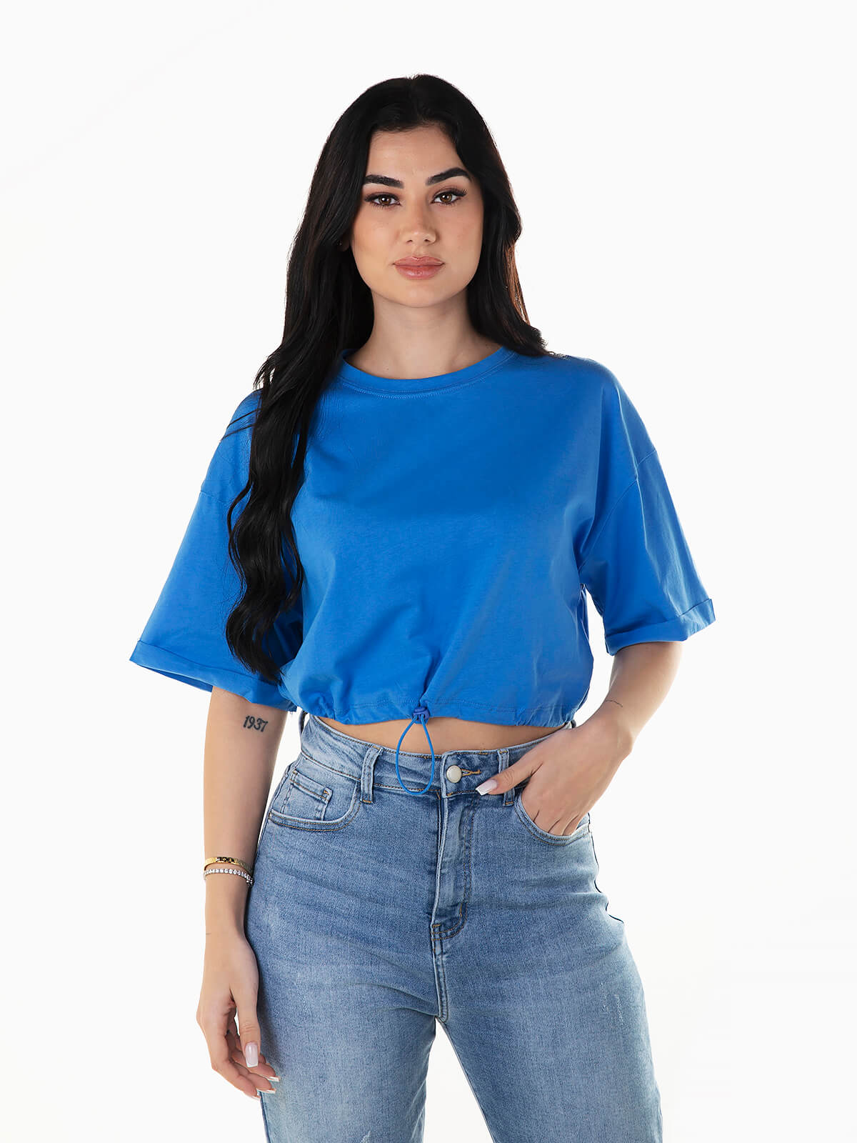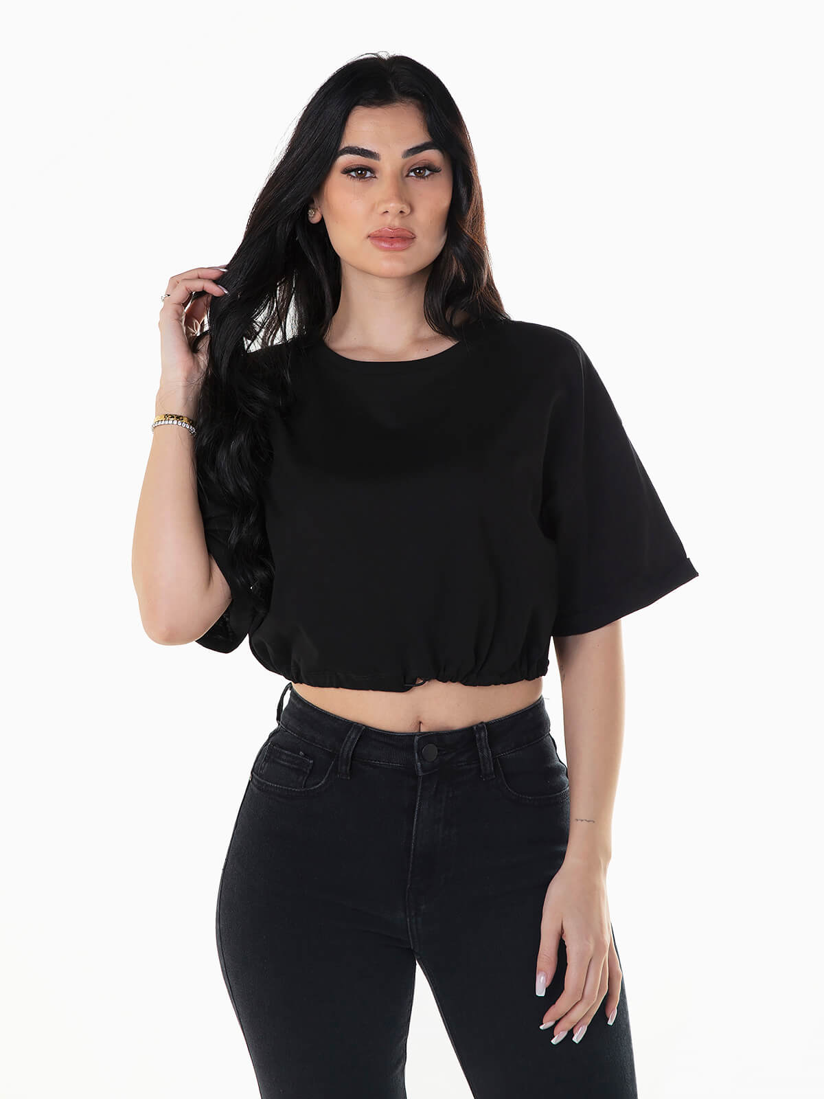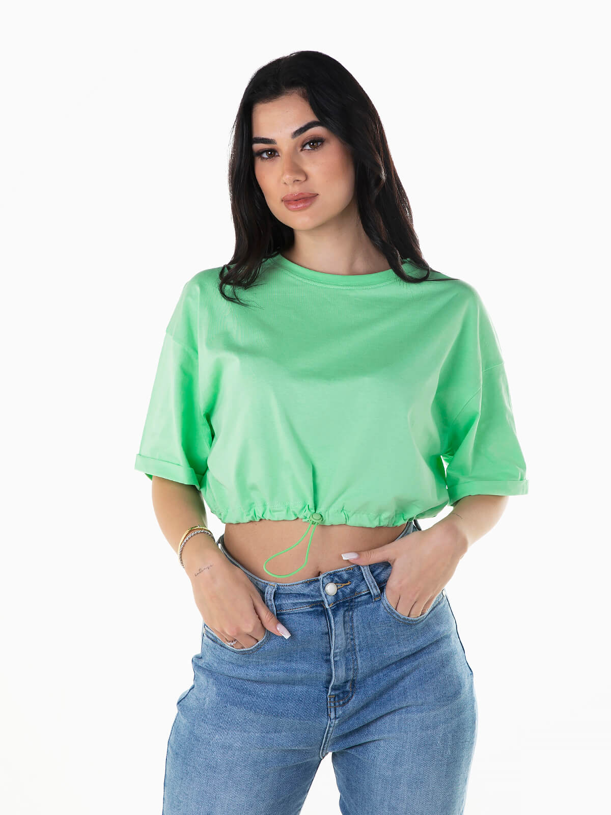 T-shirt cropped de manga curta. T-shirt oversize com elástico na base para ajustar. Decote redondo.