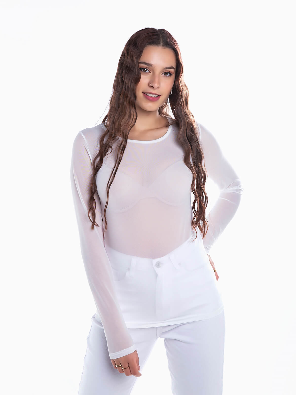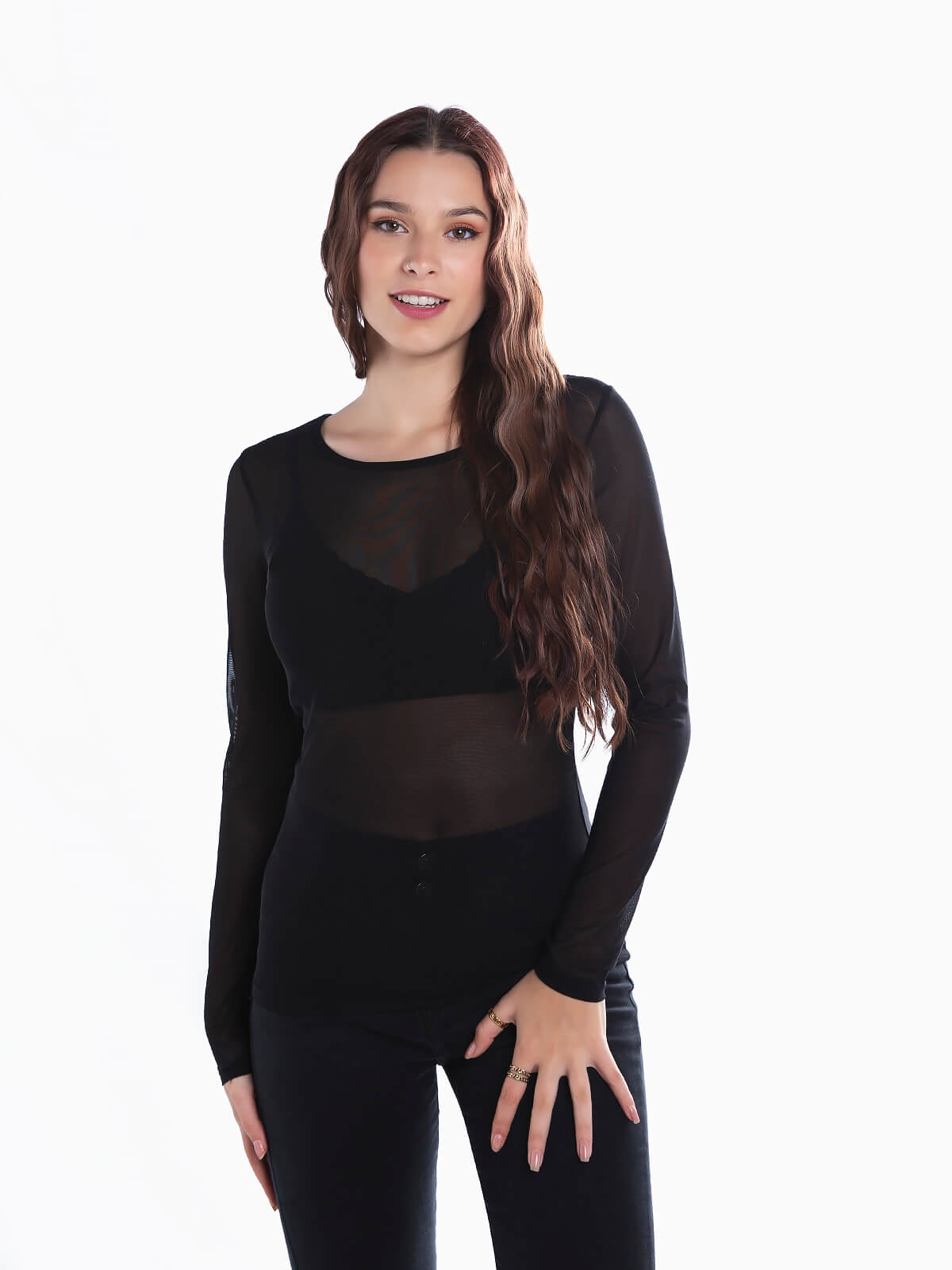 T-shirt em tule liso para senhora. T-shirt de manga comprida em tecido semitransparente com decote redondo.