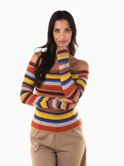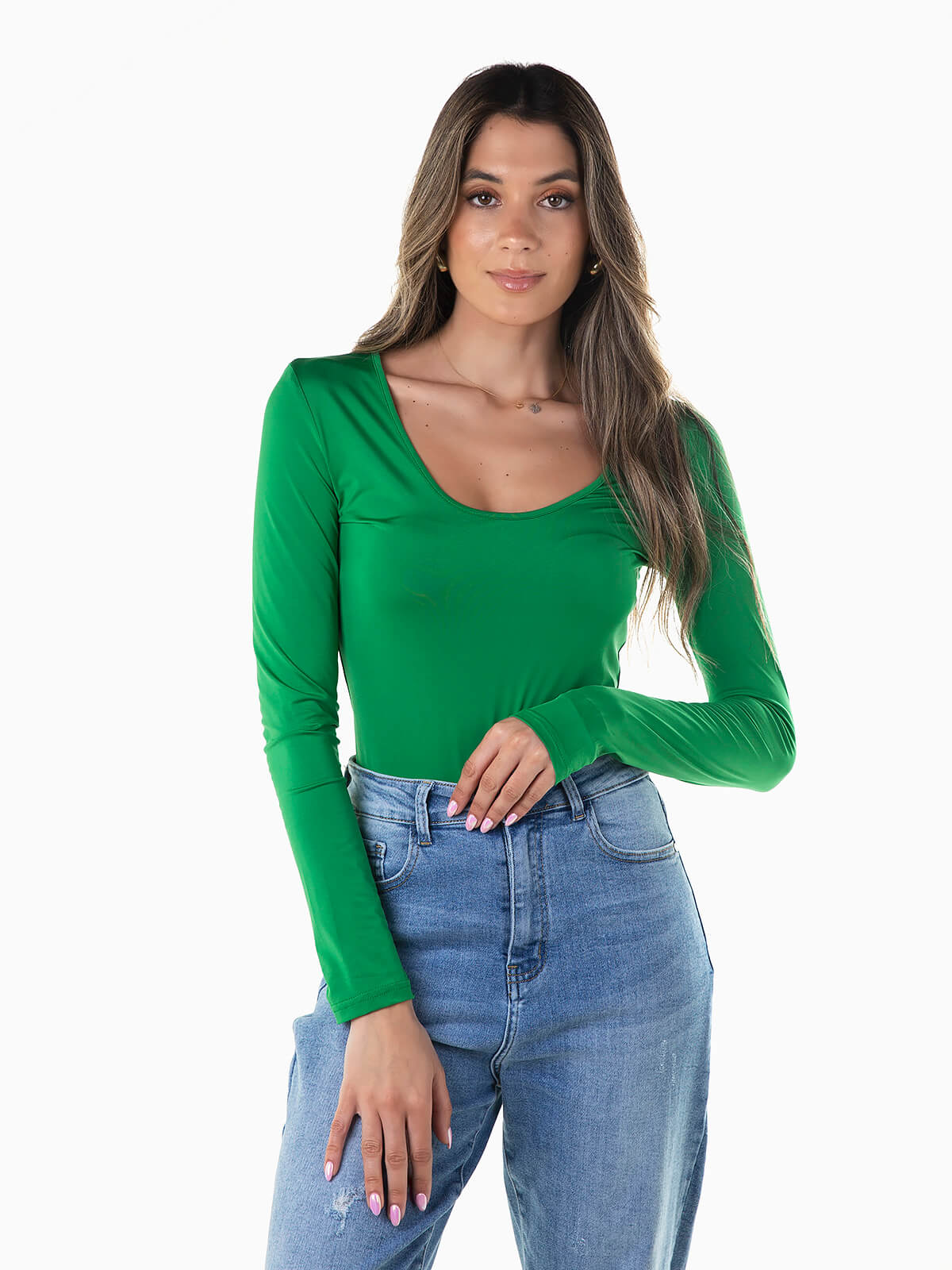 T-shirt elástica de manga comprida para senhora. T-shirt com decote redondo.