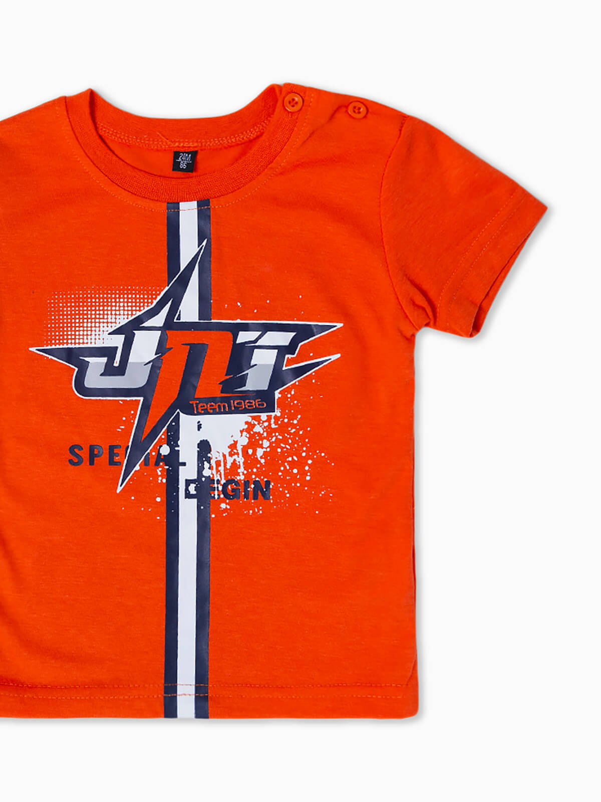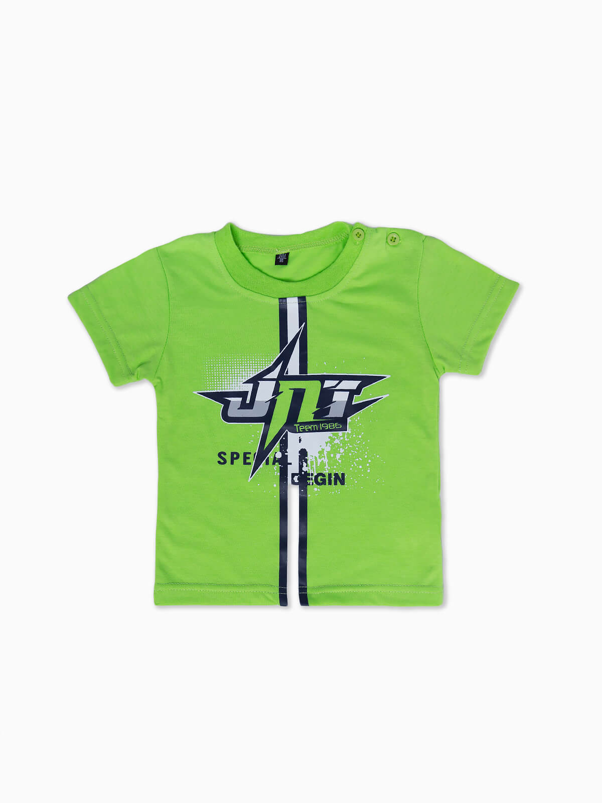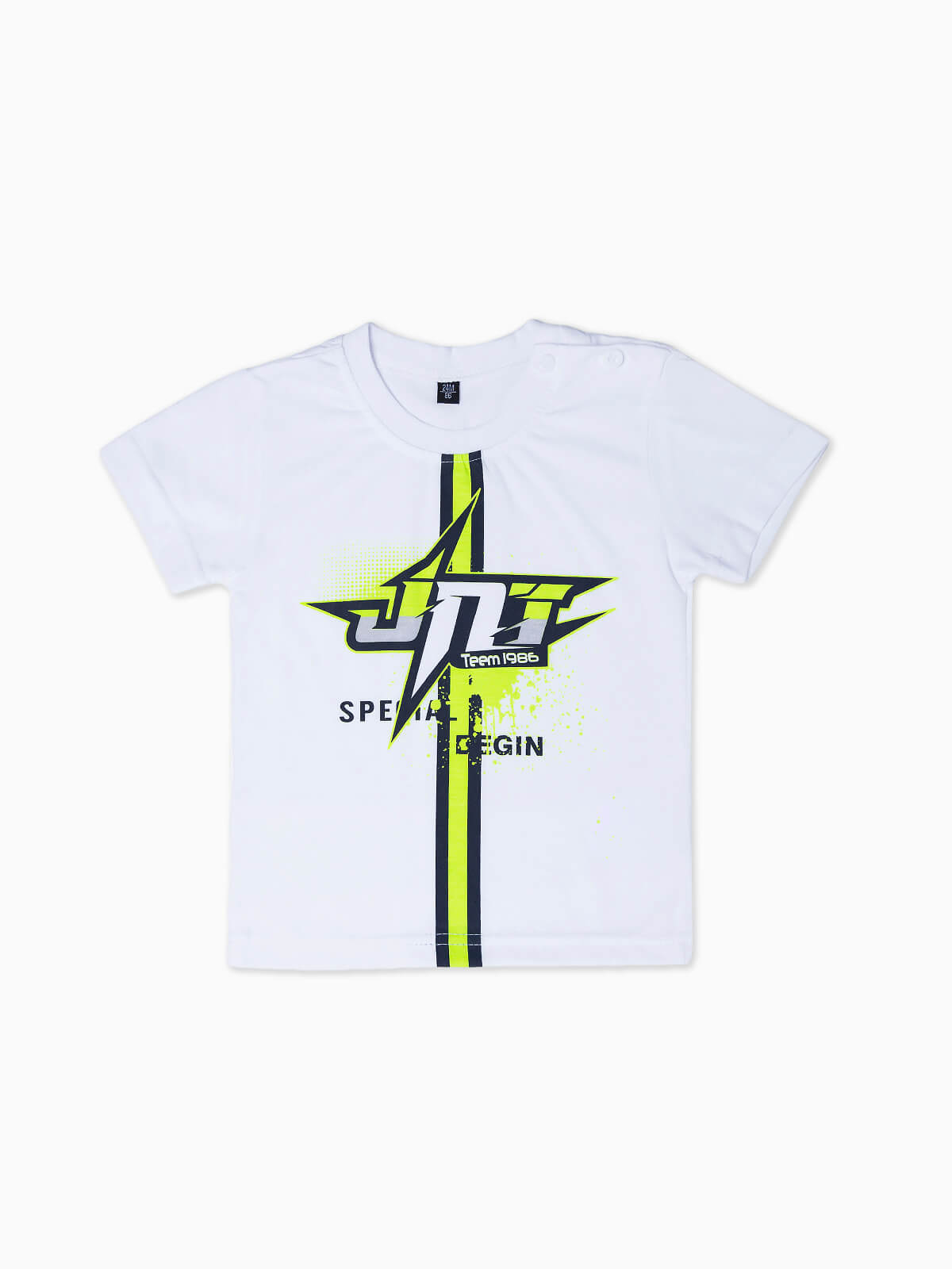 T-shirt estampada para bebé menino. T-shirt de manga curta com gola redonda e aperto de botões.