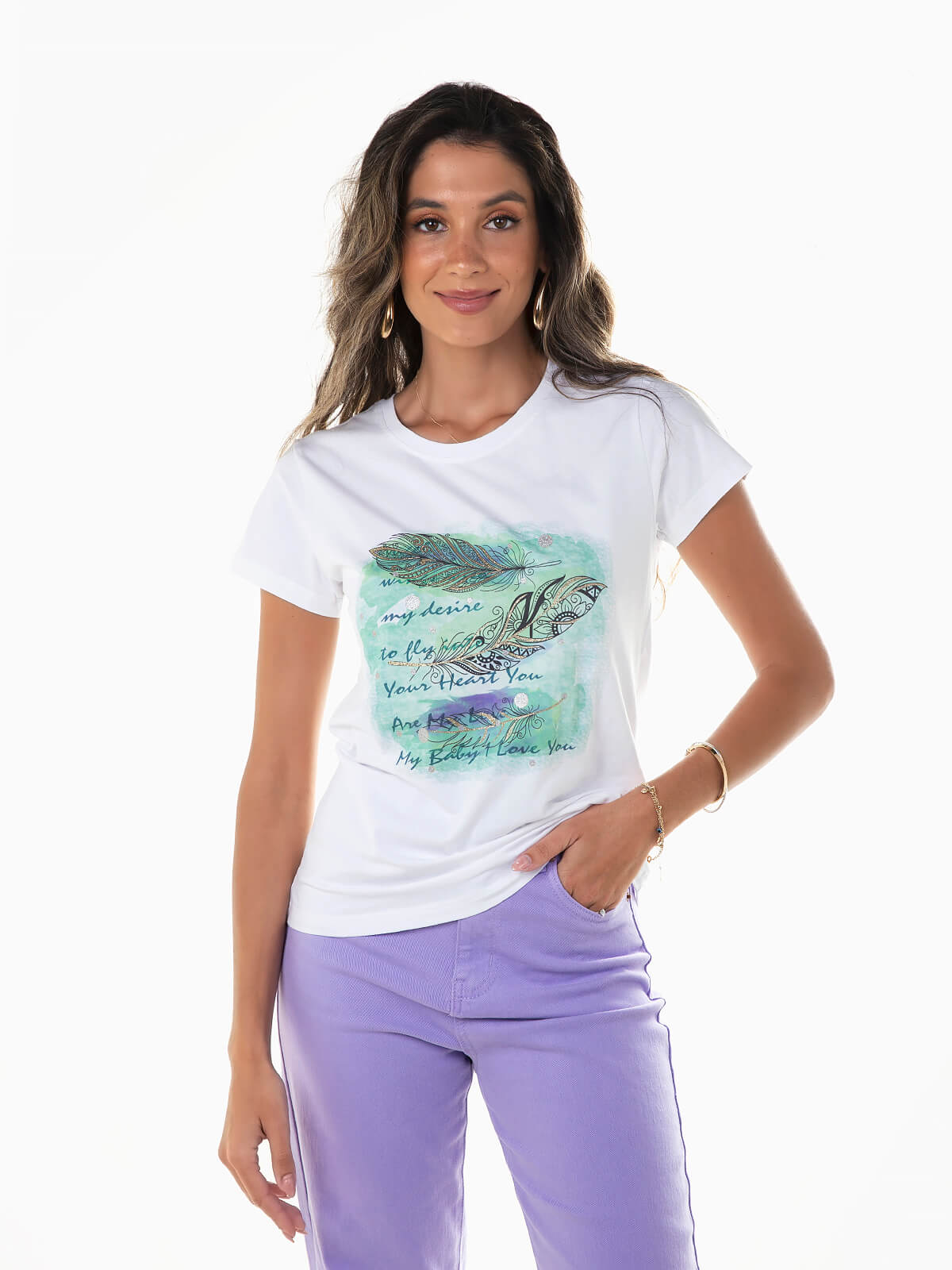 T-shirt para senhora estampada à frente com pormenores em glitter dourado. T-shirt manga curta com decote redondo.