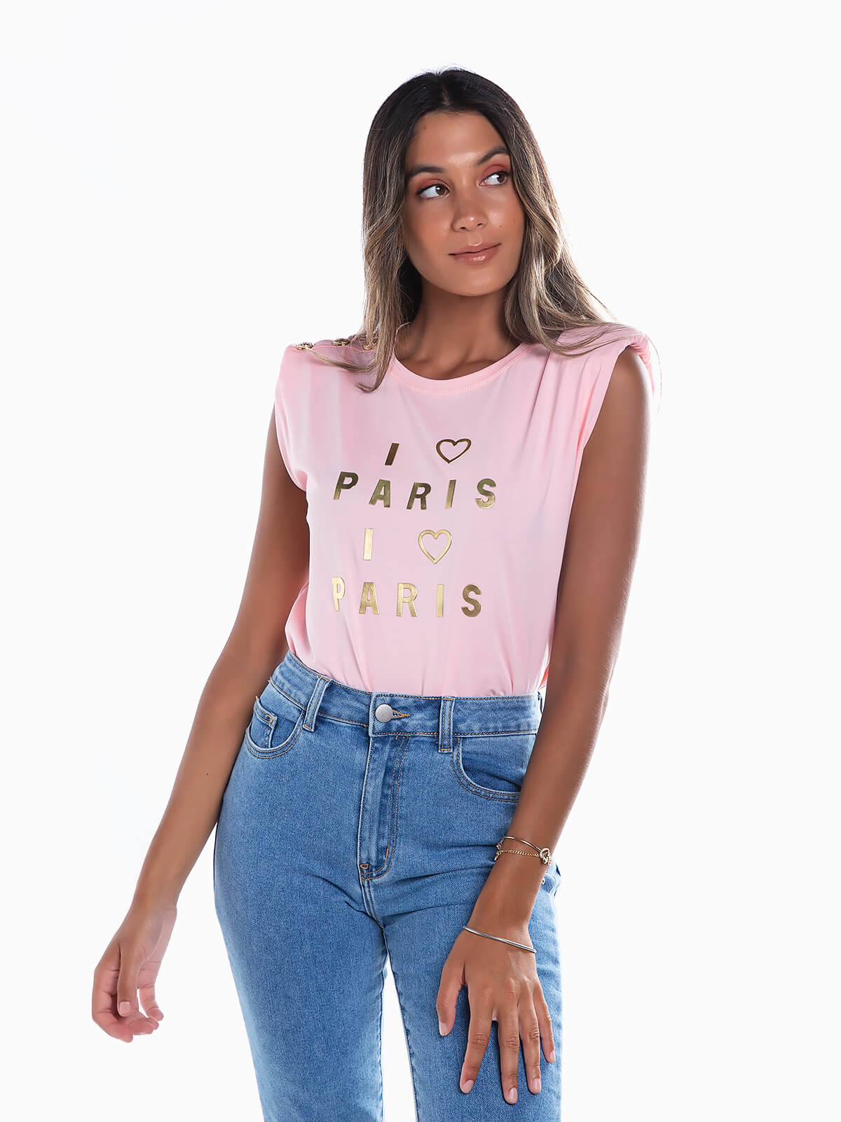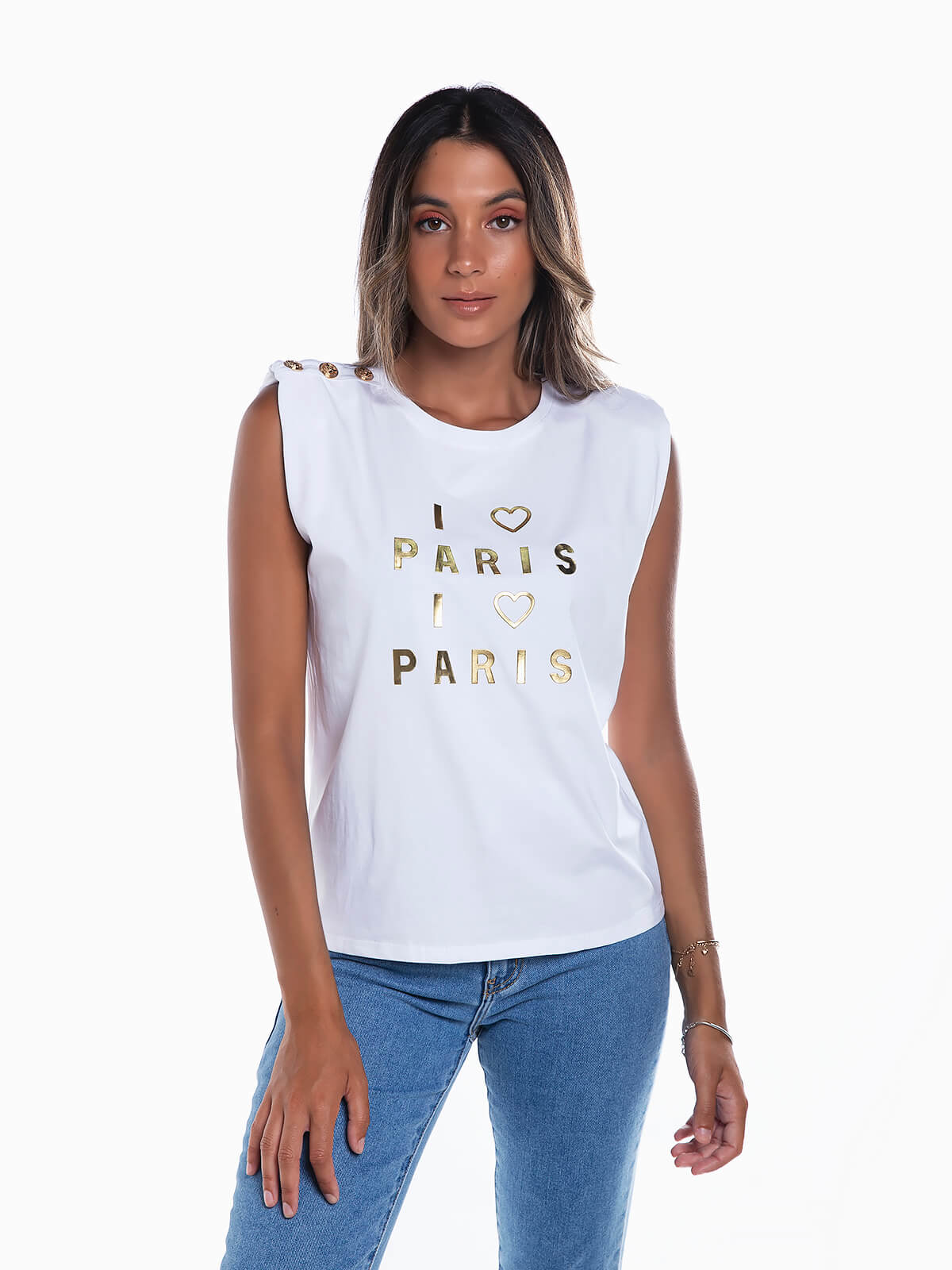 T-shirt sem mangas com estampado de letras douradas no peito. T-shirt com botões aplicados na ombreira. Decote redondo.