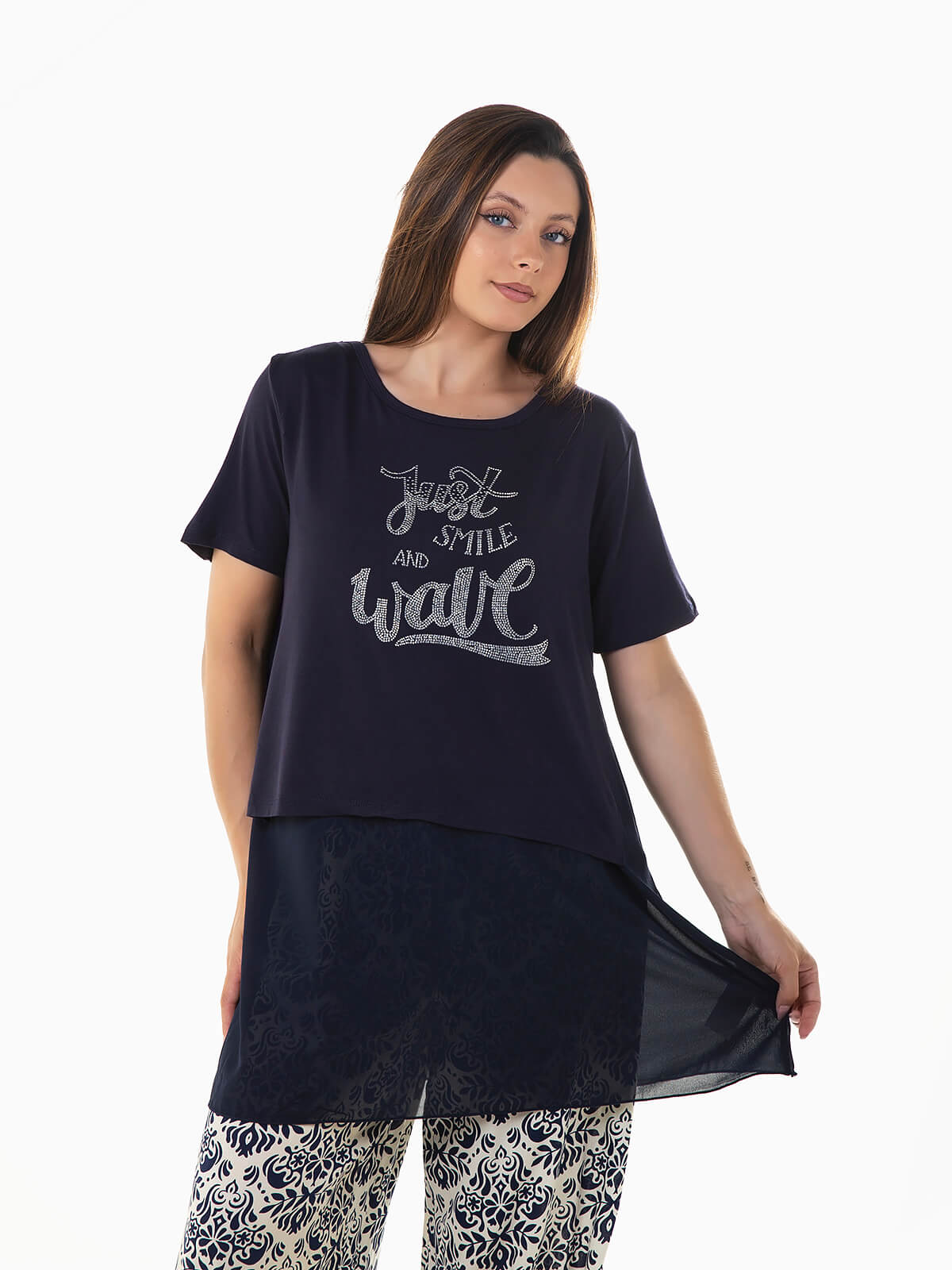 T-shirt estampada combinado com tecido semitransparente na base. T-shirt de manga curta para senhora com decote redondo.