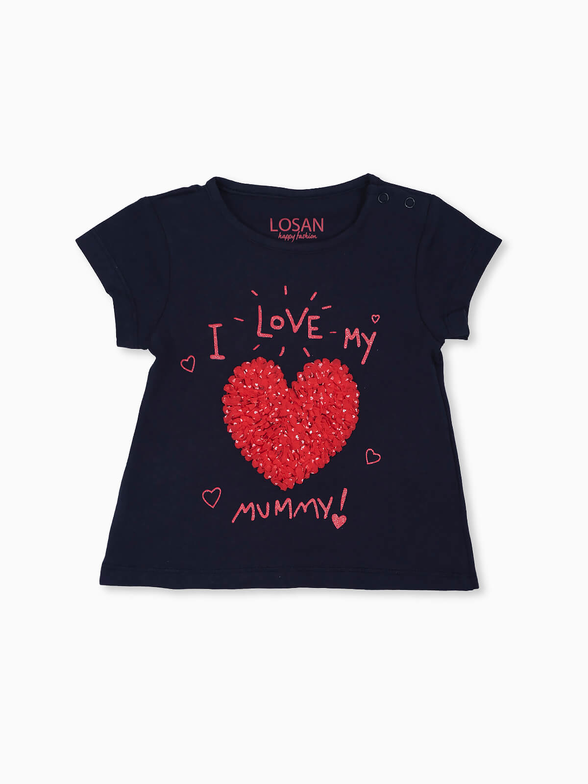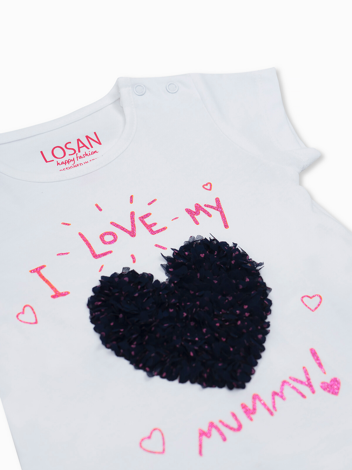 T-shirt bebé estampada com coração em tule. T-shirt manga curta em algodão. Botões no ombro. Gola redonda.