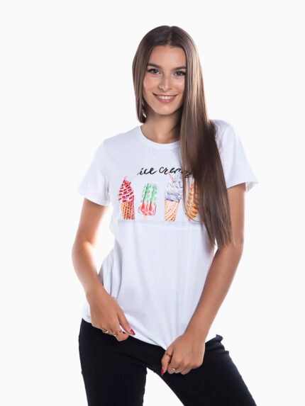 T-shirt estampada perfume com brilhantes. T-shirt sem mangas com folhos em tule na cava. Gola redonda.