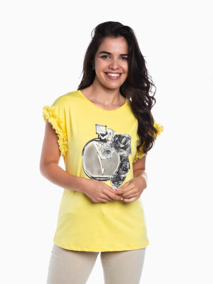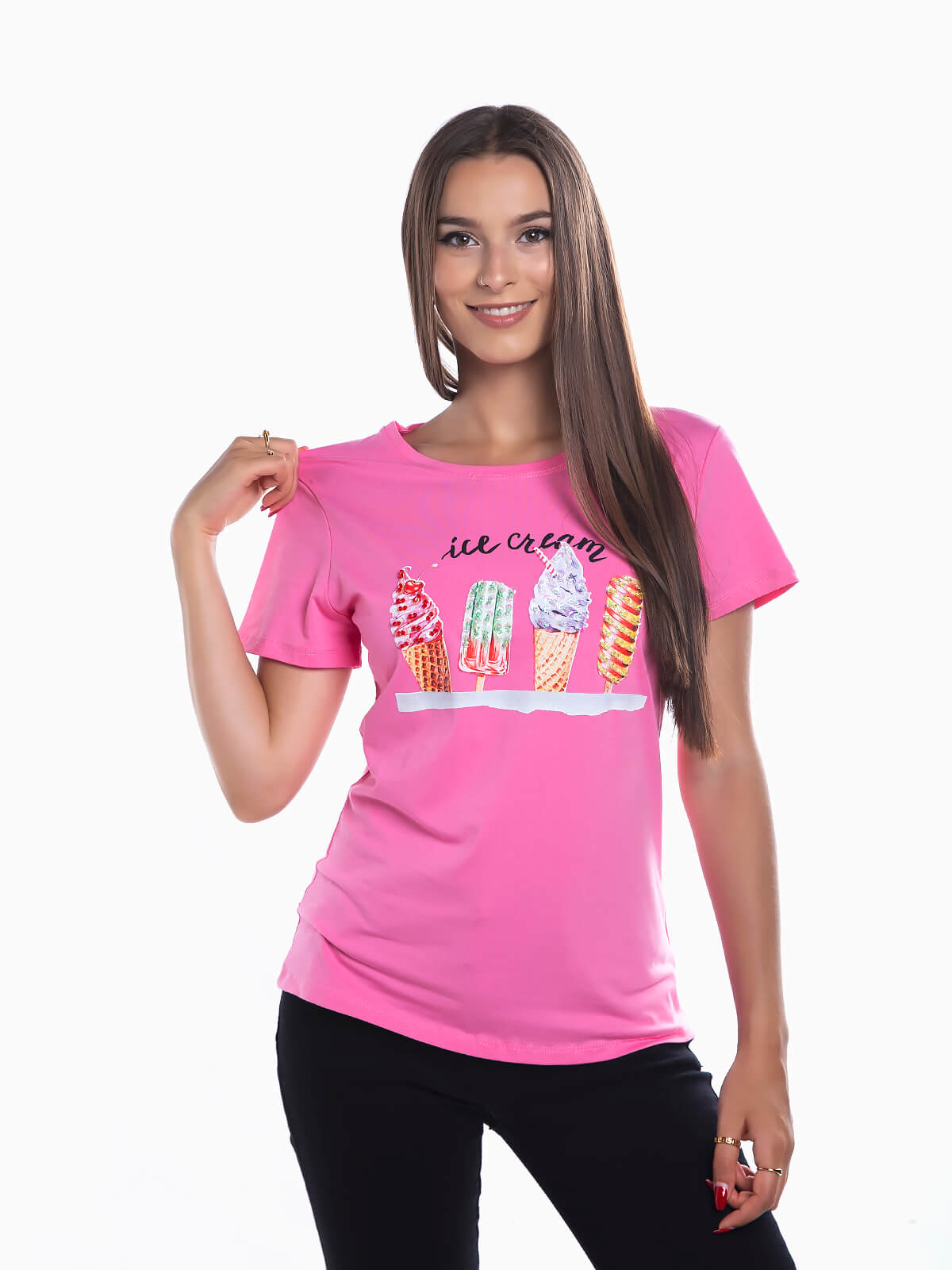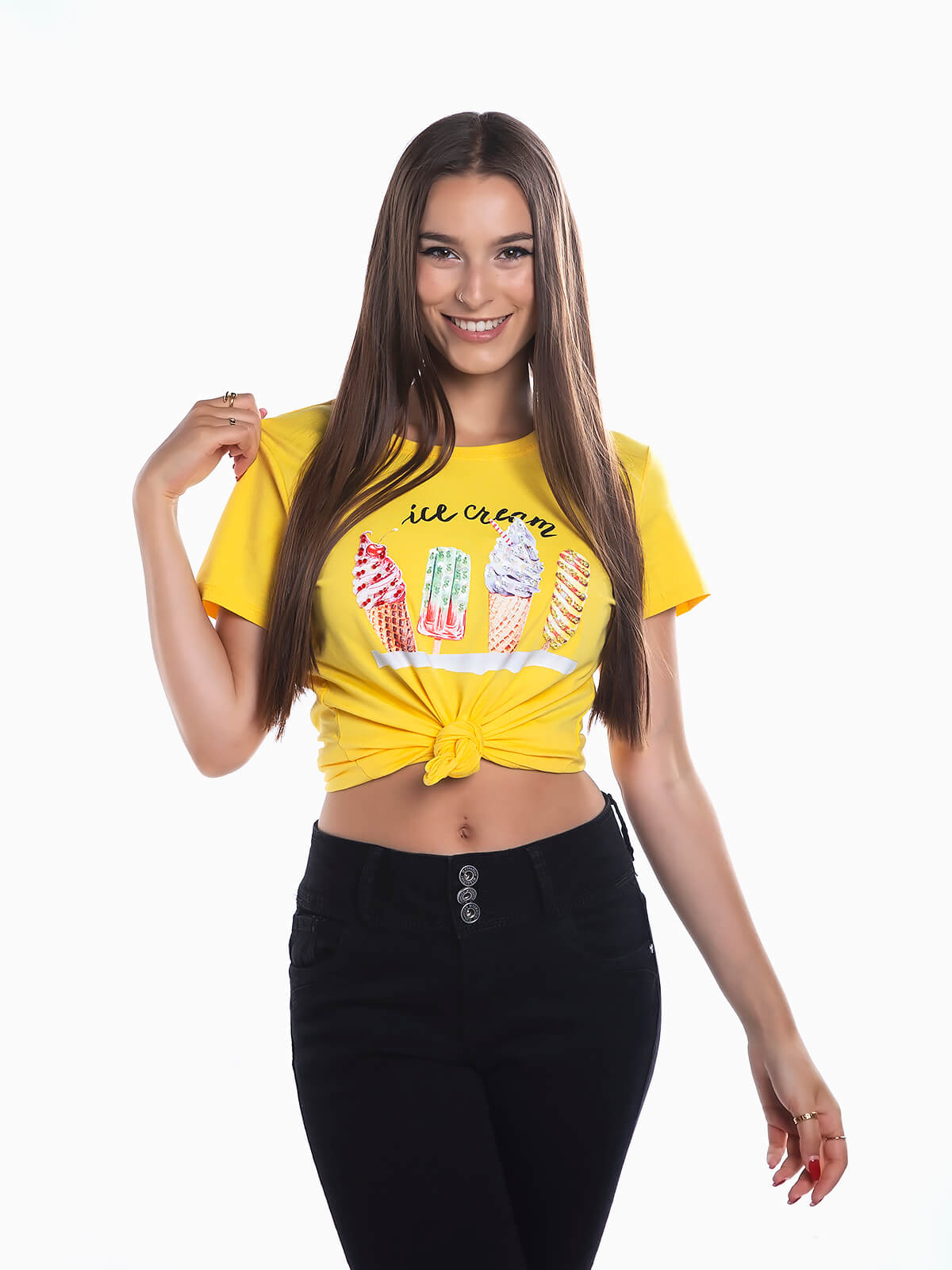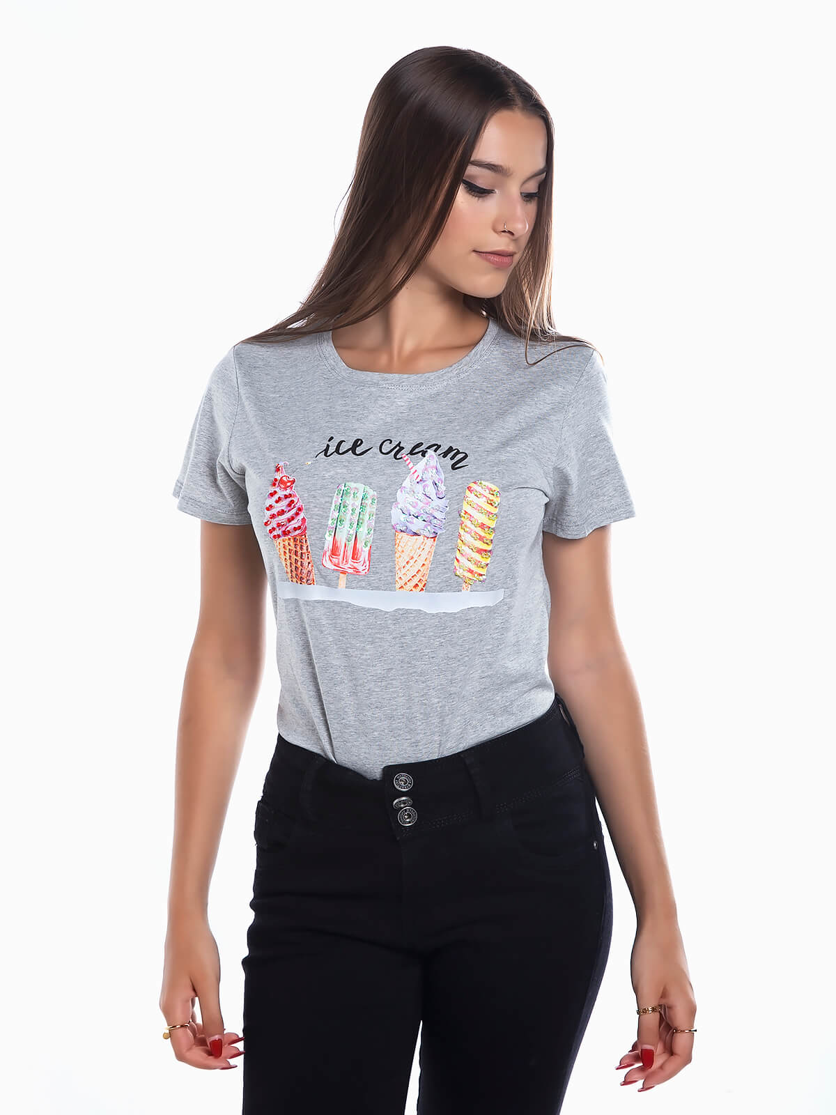T-shirt estampada gelados com lantejoulas. T-shirt manga curta em algodão. Gola redonda.