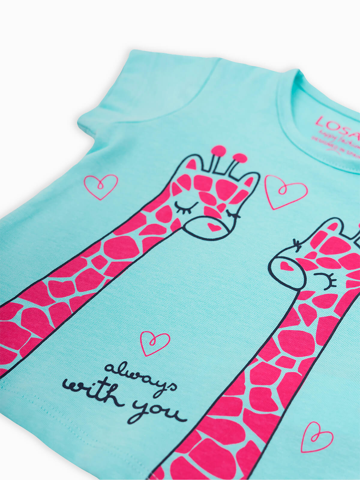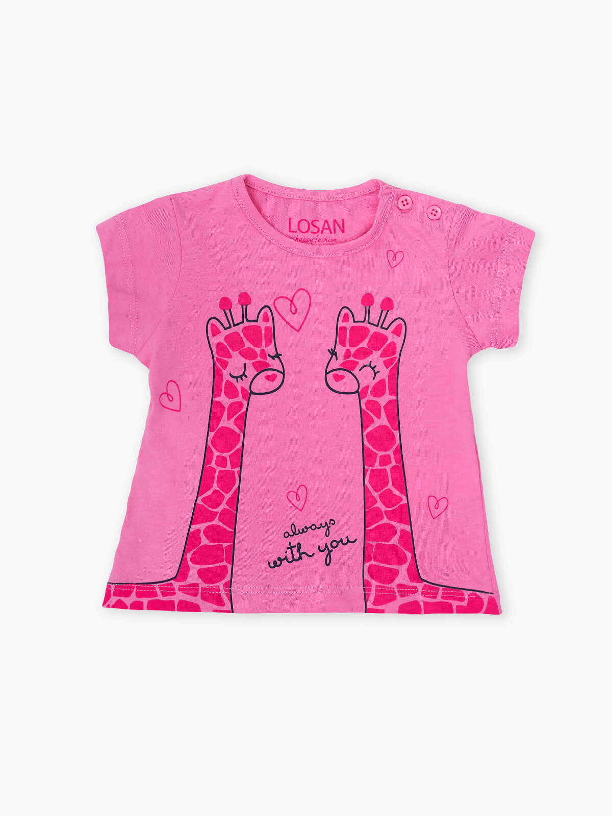 T-shirt bebé estampada girafas. T-shirt manga curta em algodão. Botões no ombro. Gola redonda.