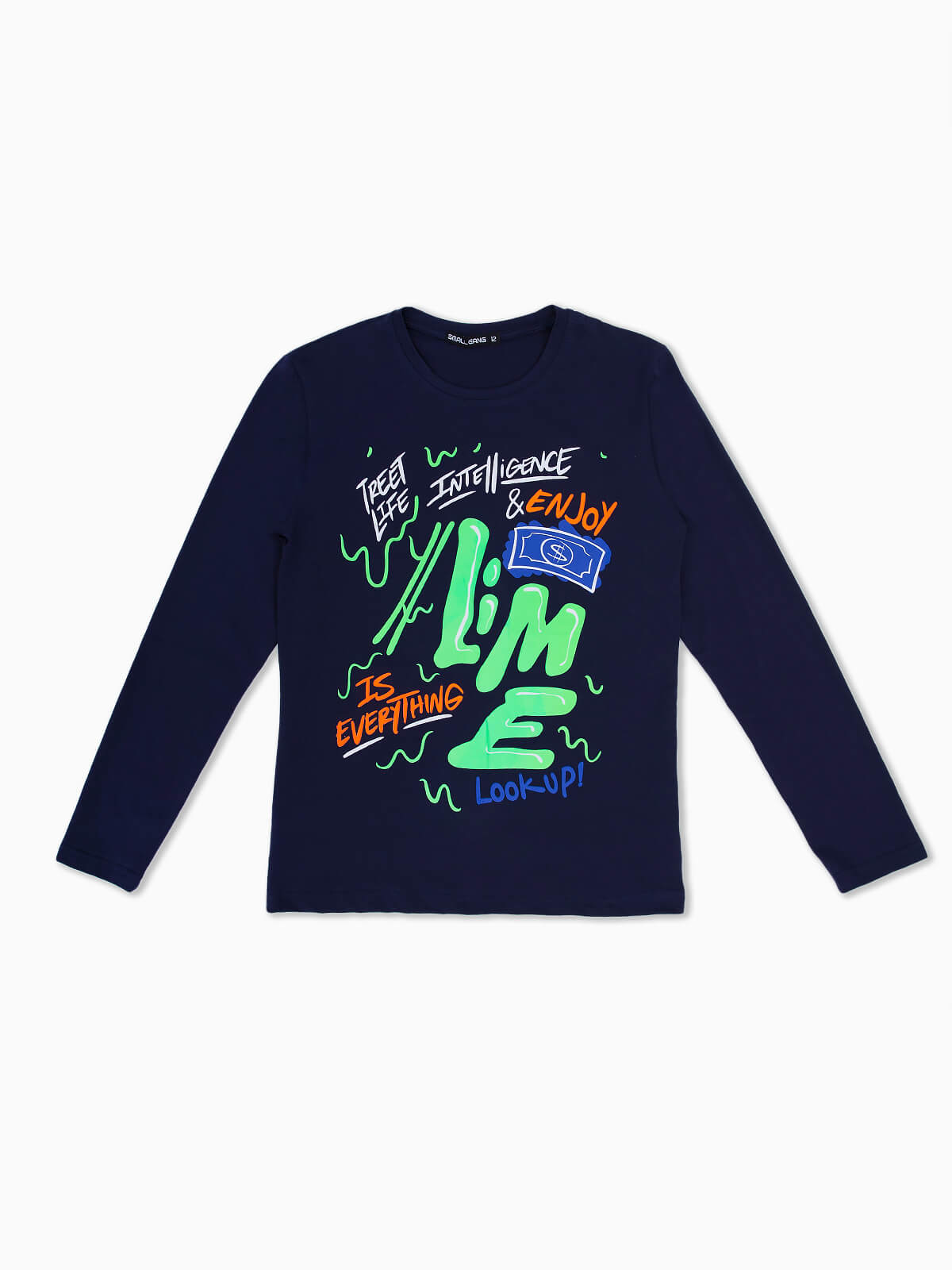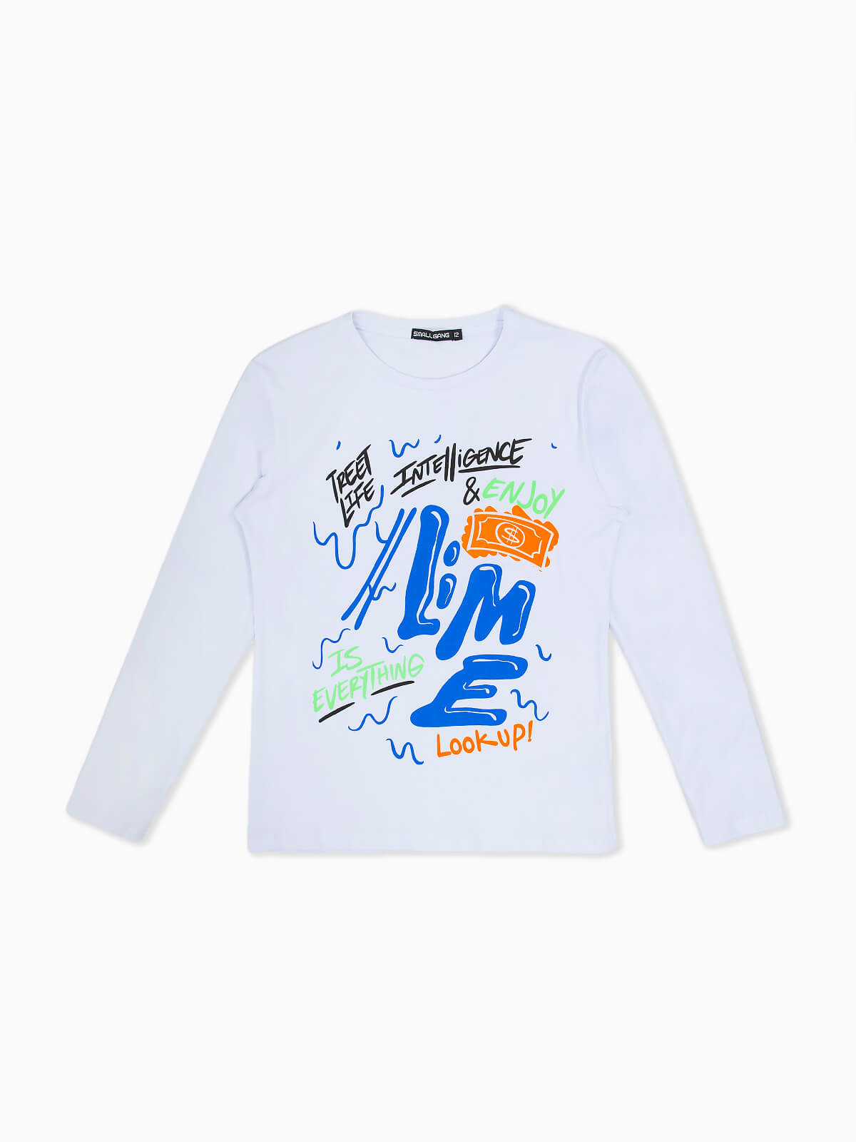 T-shirt com estampado de letras coloridas para menino. T-shirt de manga comprida com gola redonda.