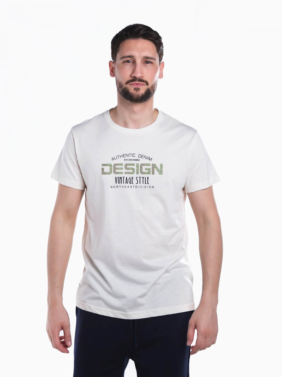 T-shirt com estampado de letras no peito e manga curta. T-shirt para homem em tecido 100% algodão com gola redonda.