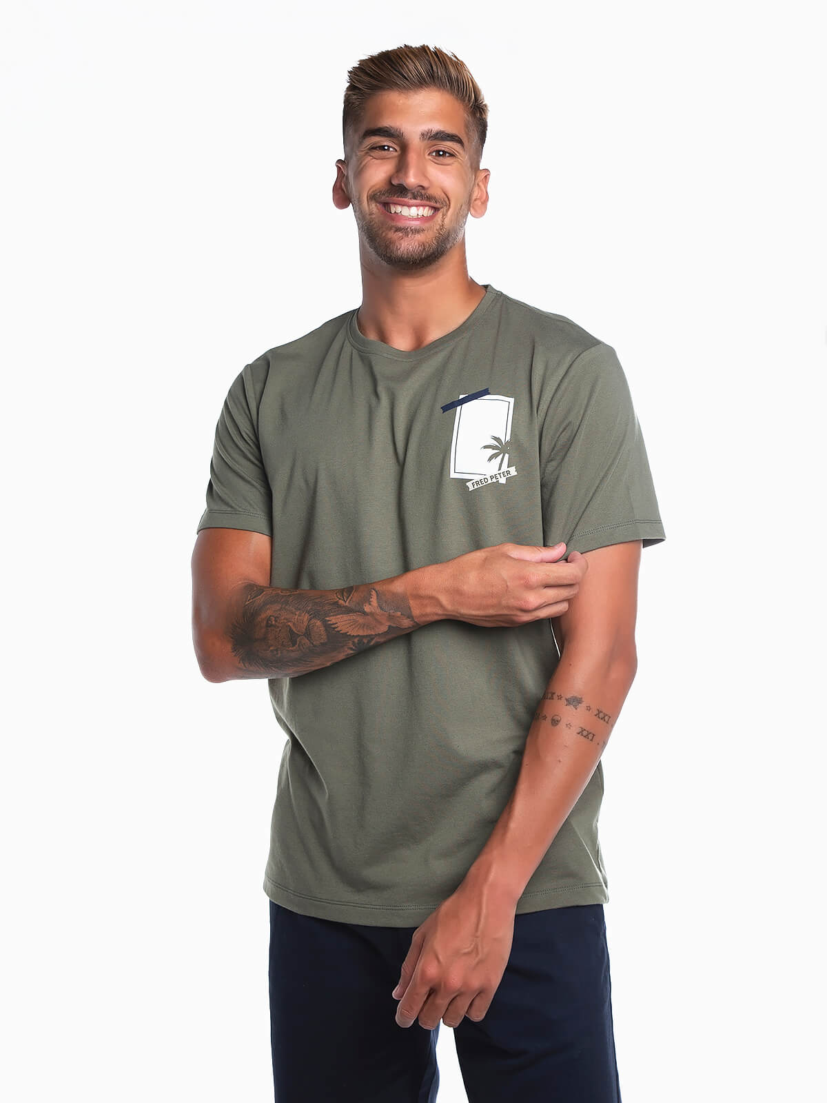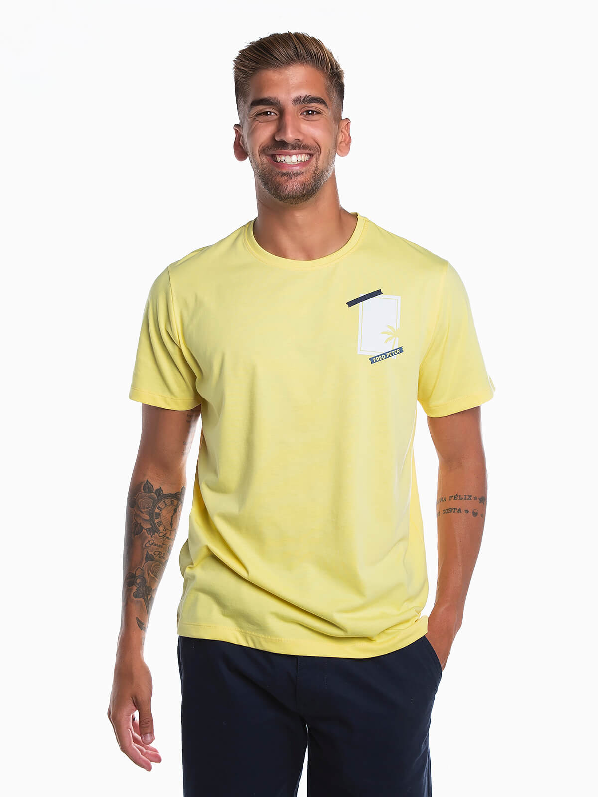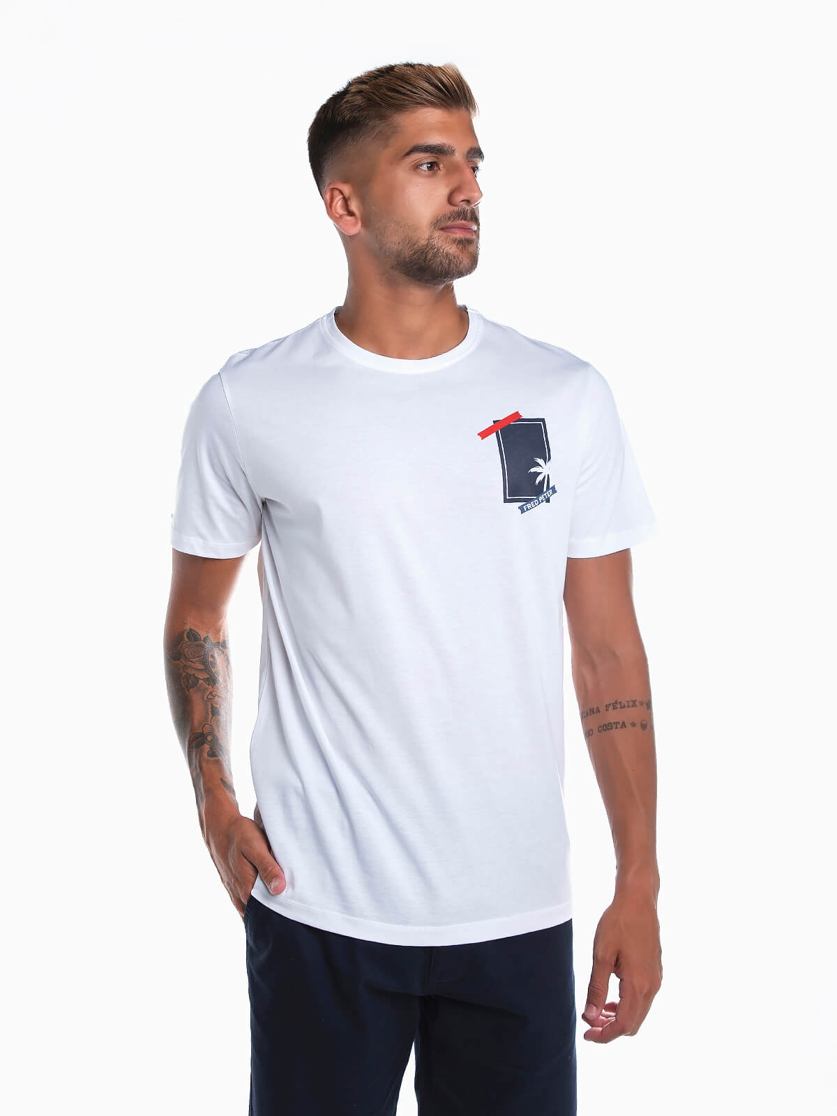 T-shirt com imagem estampada no peito de manga curta. T-shirt para homem em tecido 100% algodão com gola redonda.