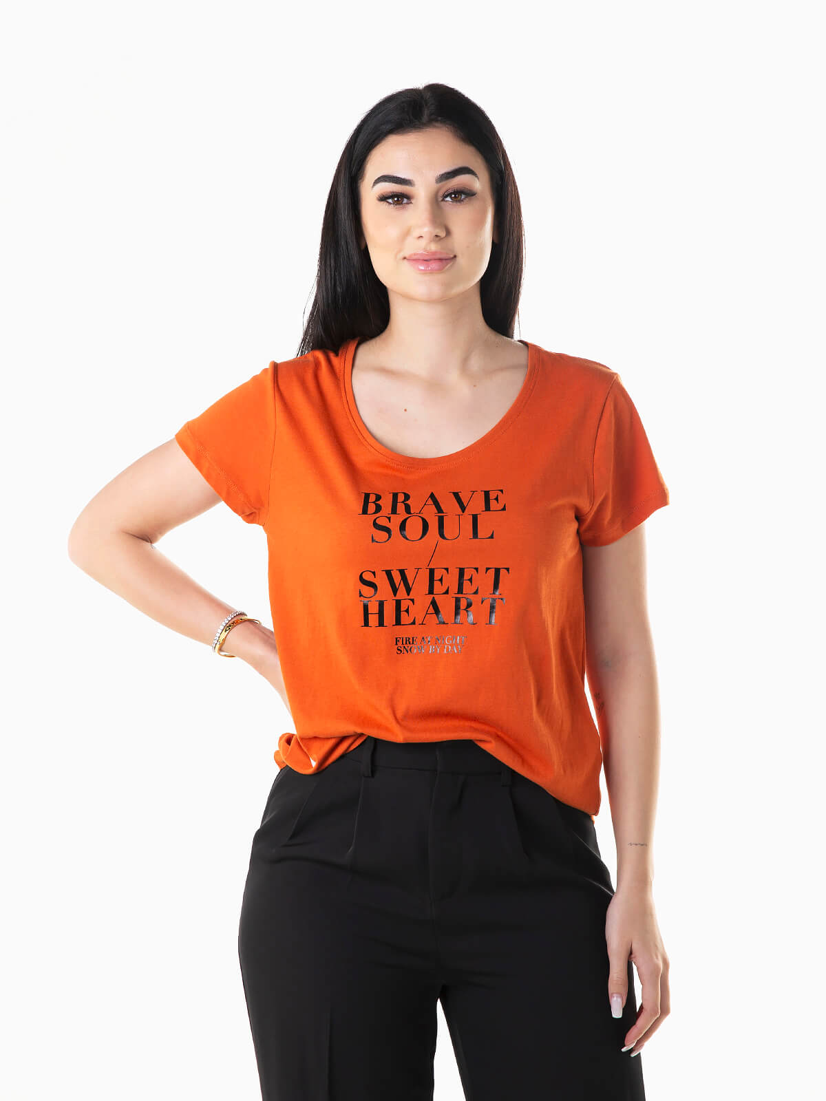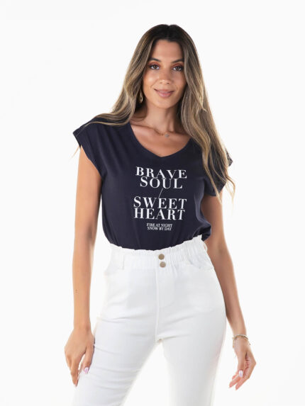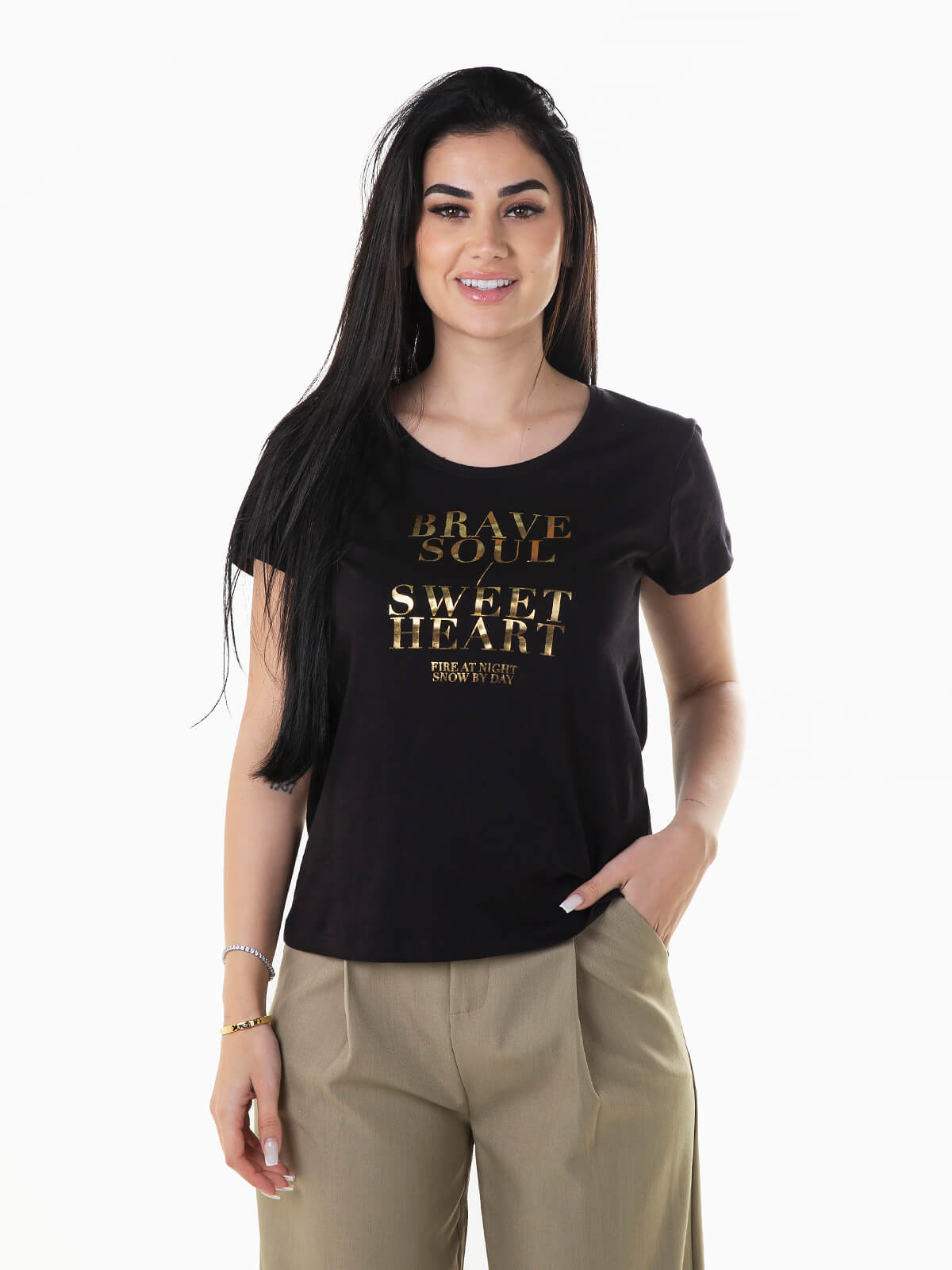 T-shirt de manga curta em tecido 100% algodão para maior conforto. T-shirt para senhora com estampado no peito e decote redondo.