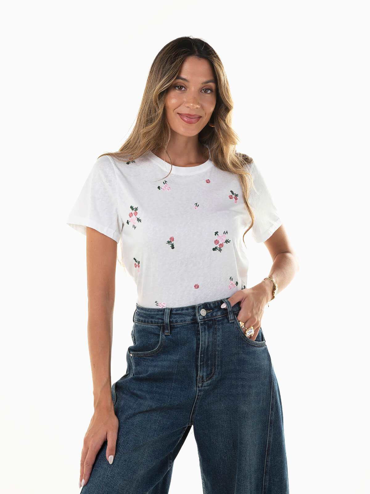 T-shirt de manga curta com detalhe de flores bordadas que acrescentam um toque delicado à peça. Decote redondo. Um básico com twist romântico, versátil e fácil de conjugar, perfeito para usar com calças de ganga ou saias.