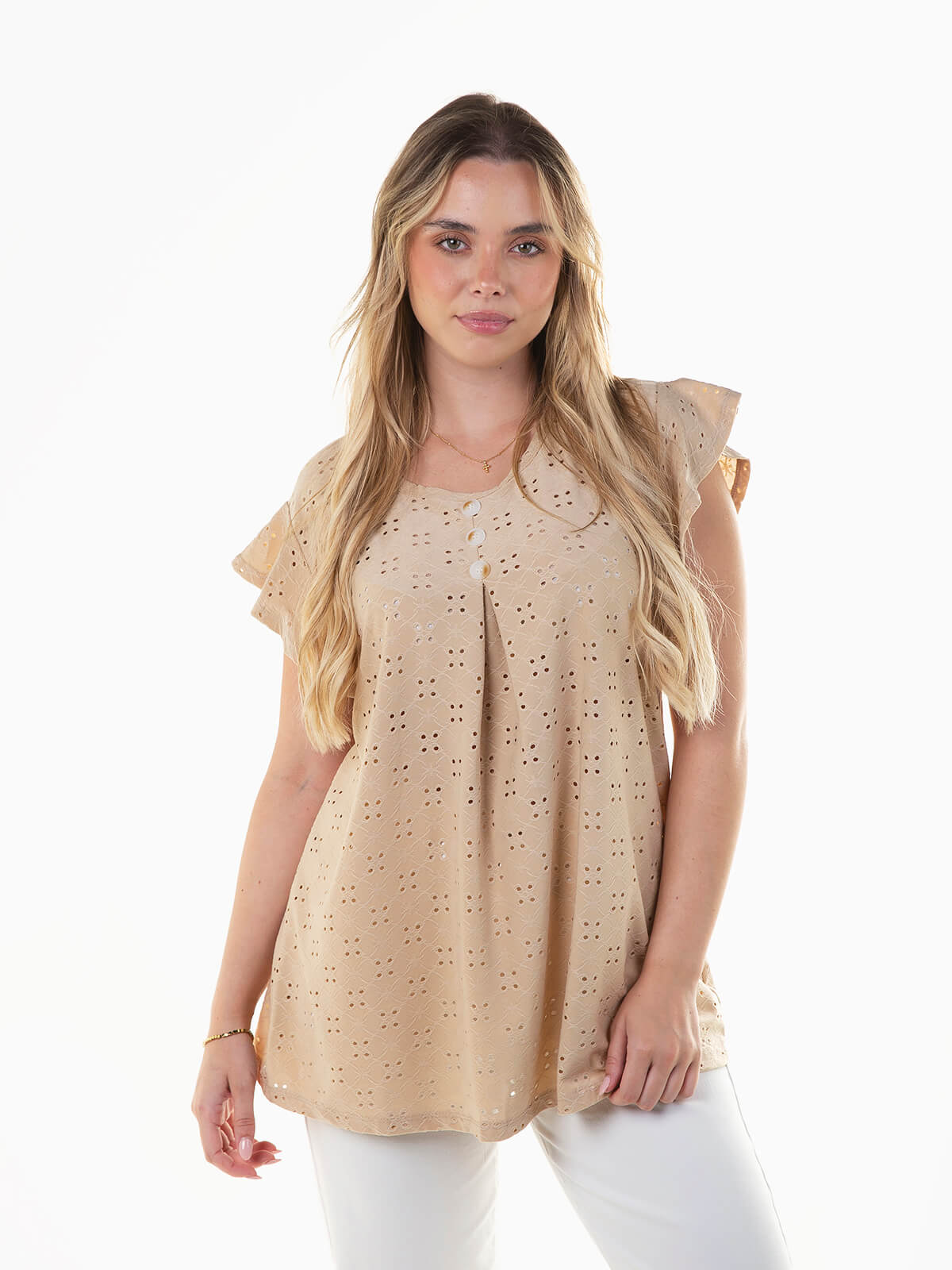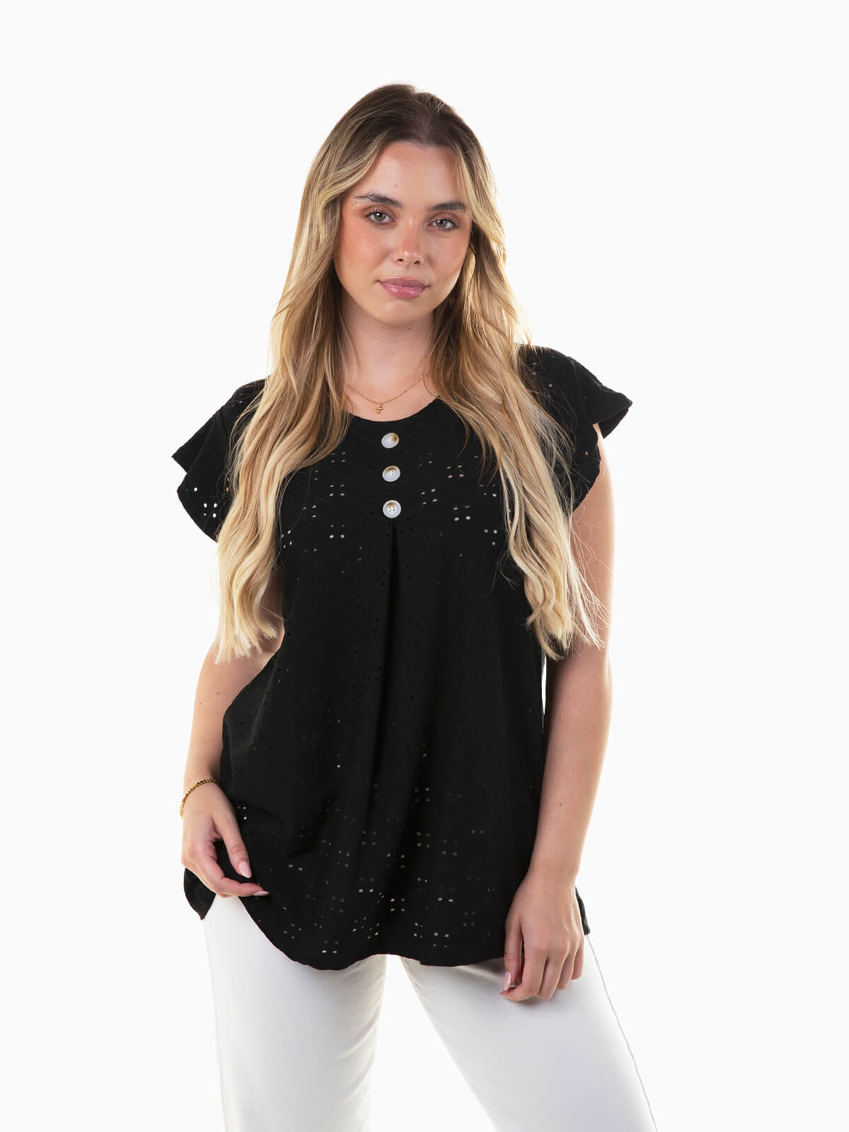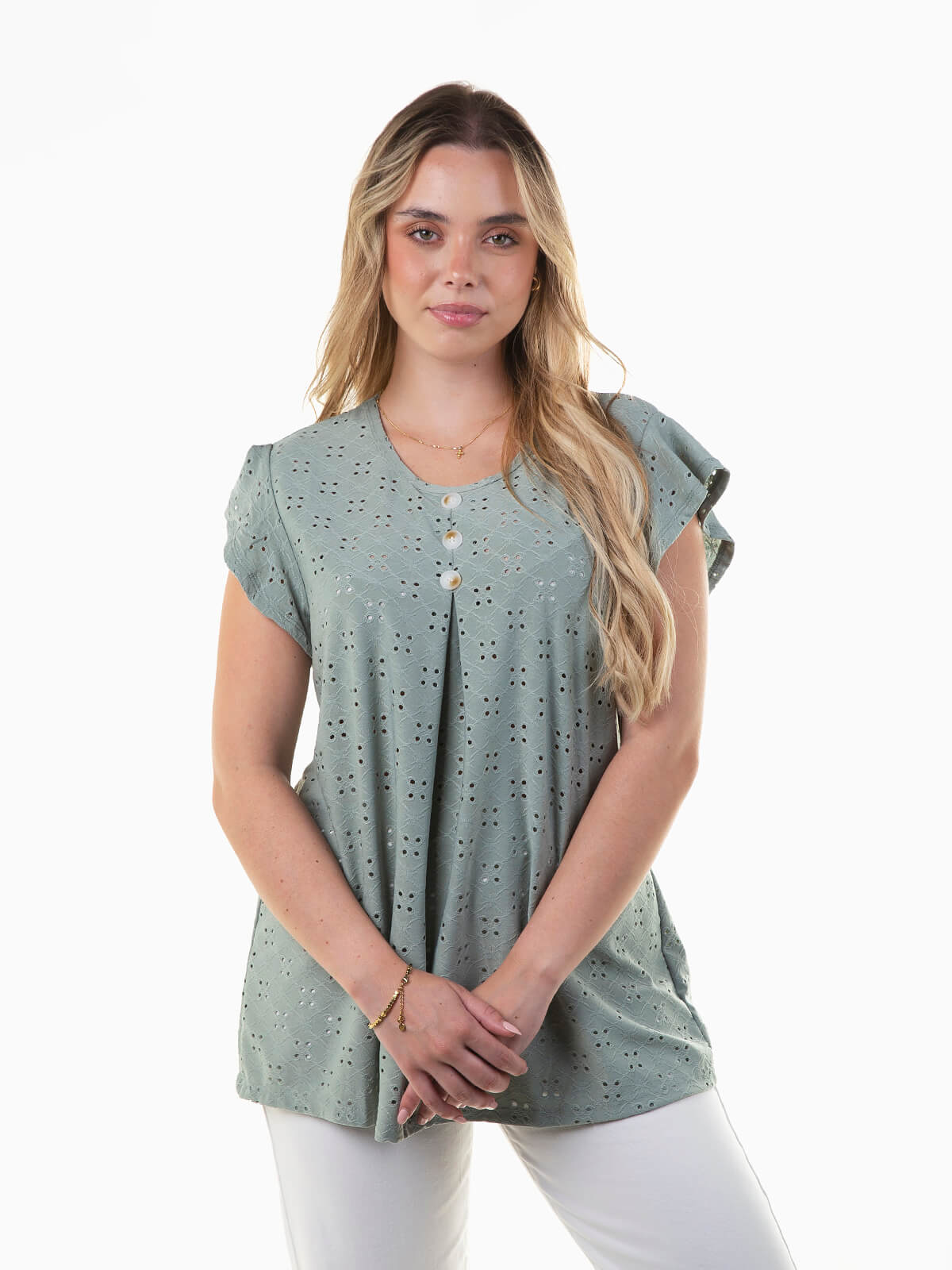 T-shirt fluída em bordado inglês com botões aplicados à frente. T-shirt manga curta para senhora com decote redondo.