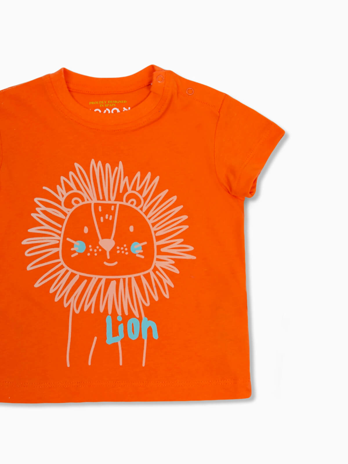 T-shirt laranja de manga curta para bebé menino. T-shirt com gola redonda e aperto de dois botões de pressão. Estampado de leão à frente.