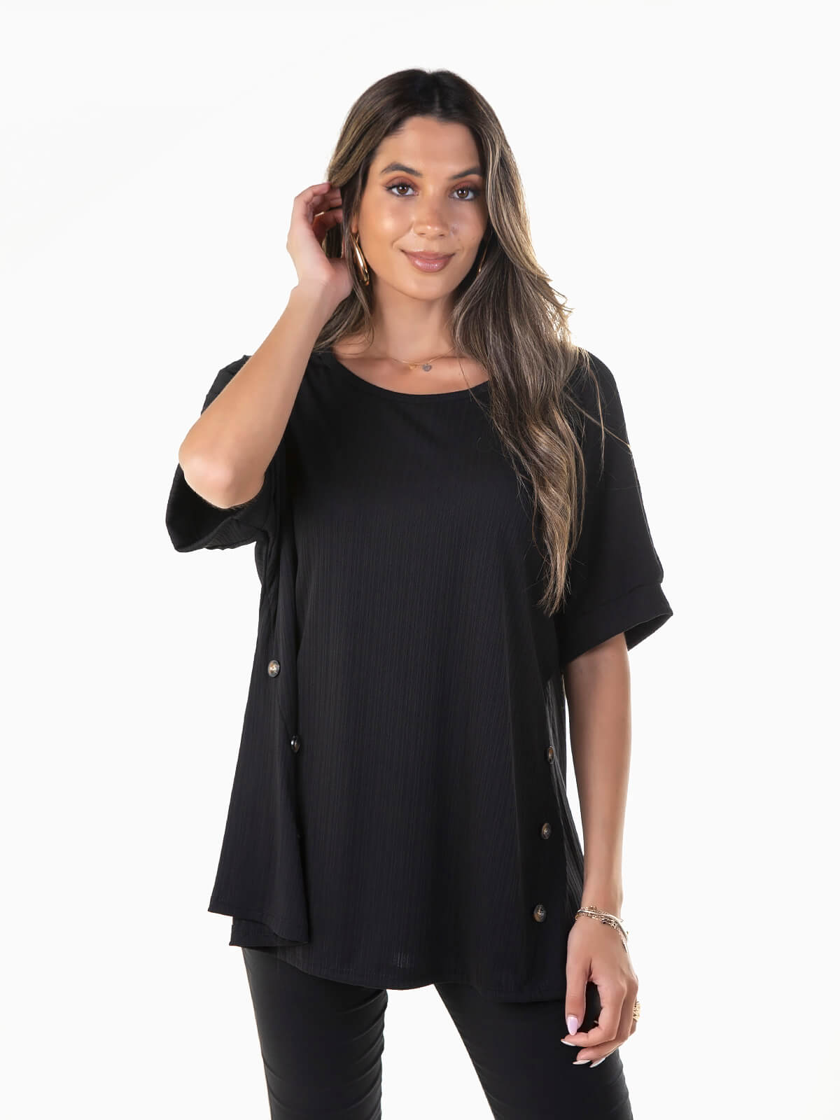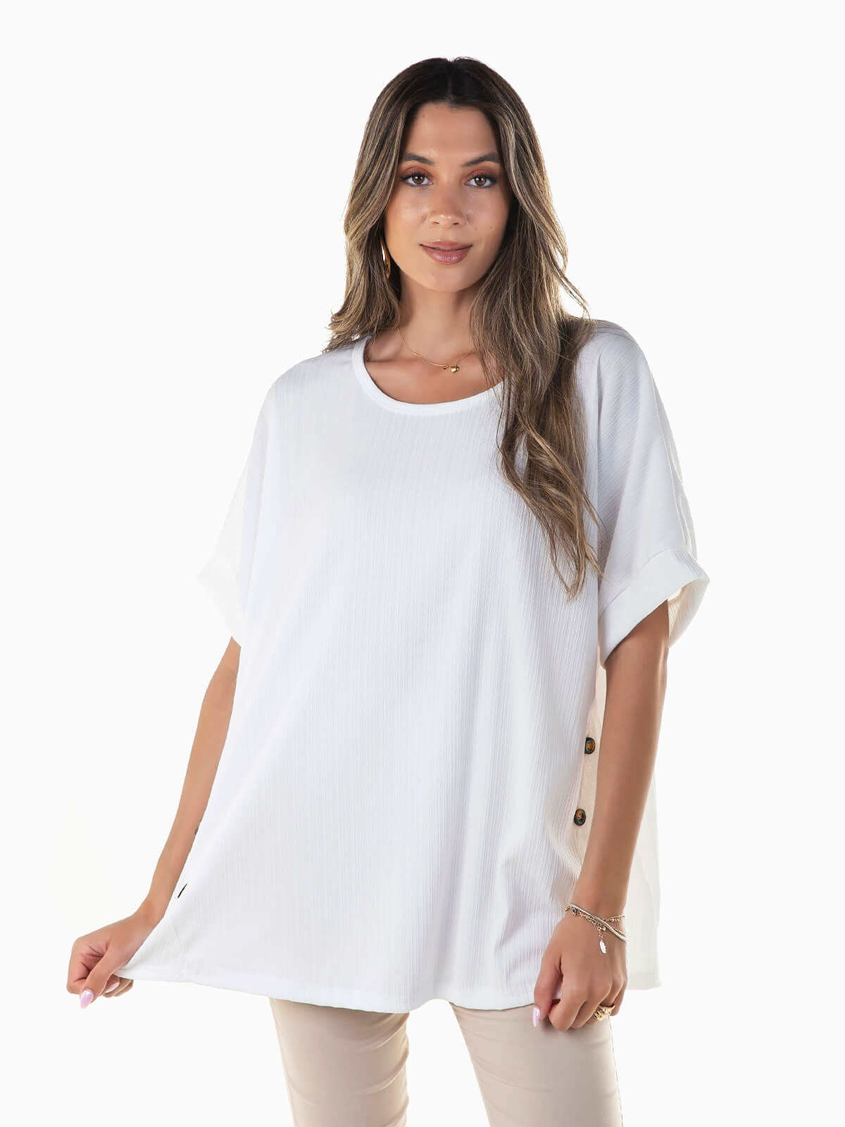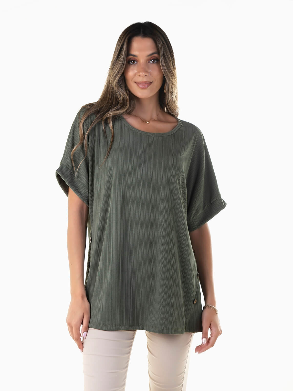 T-shirt larga de manga curta confeccionada em viscose para maior conforto e respirabilidade. T-shirt com textura e botões aplicados nas laterais. Decote redondo.