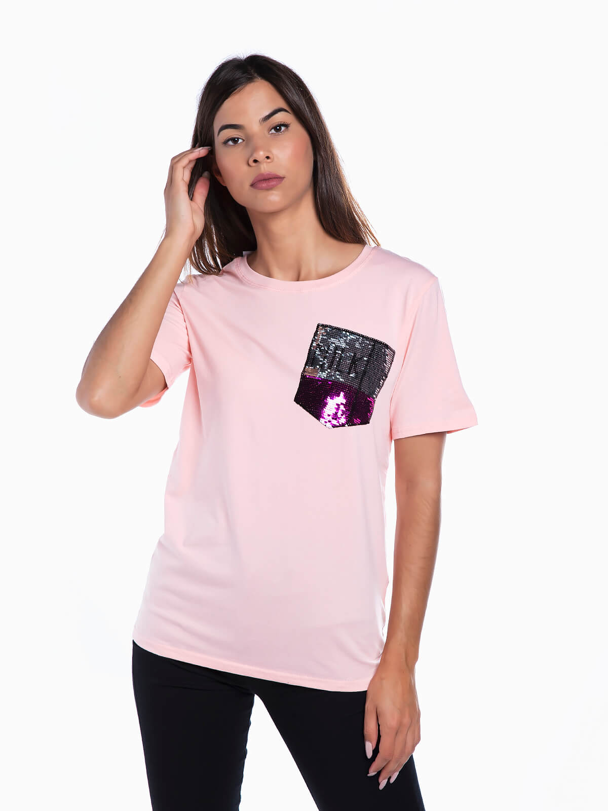T-shirt lisa com aplicação de lantejoulas a imitar bolso no peito. T-shirt manga curta em algodão. Gola redonda.