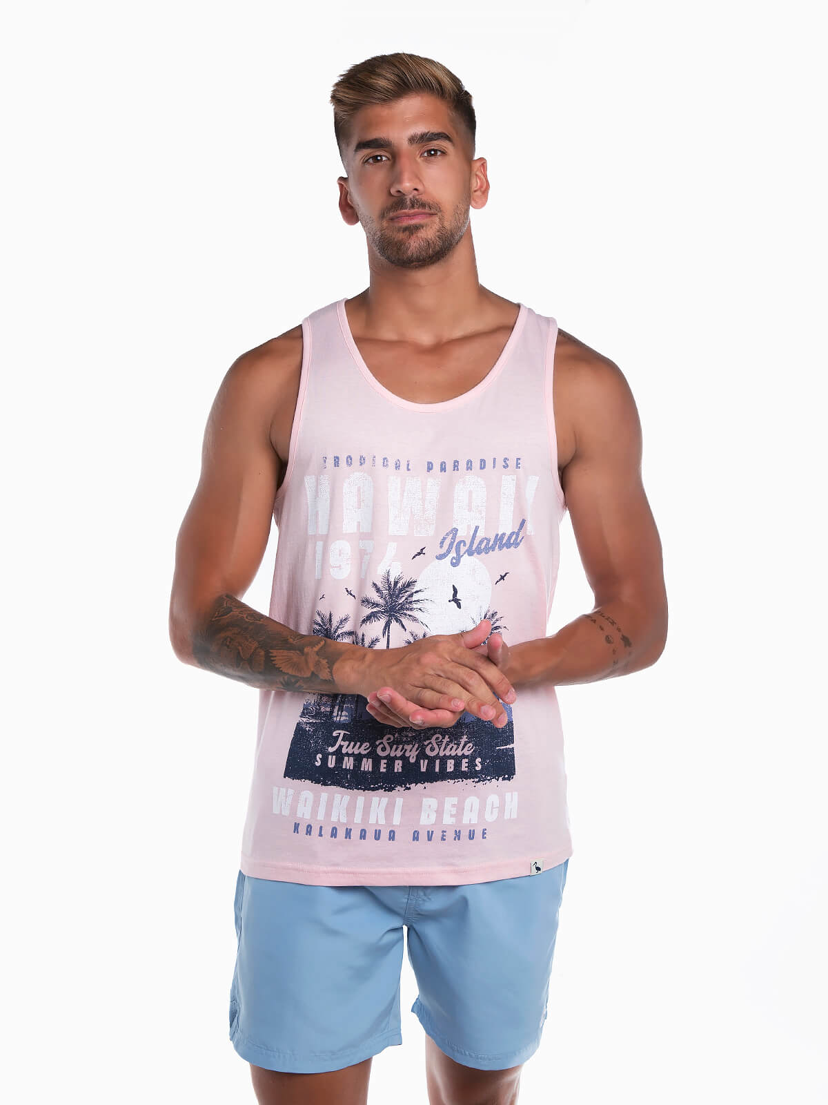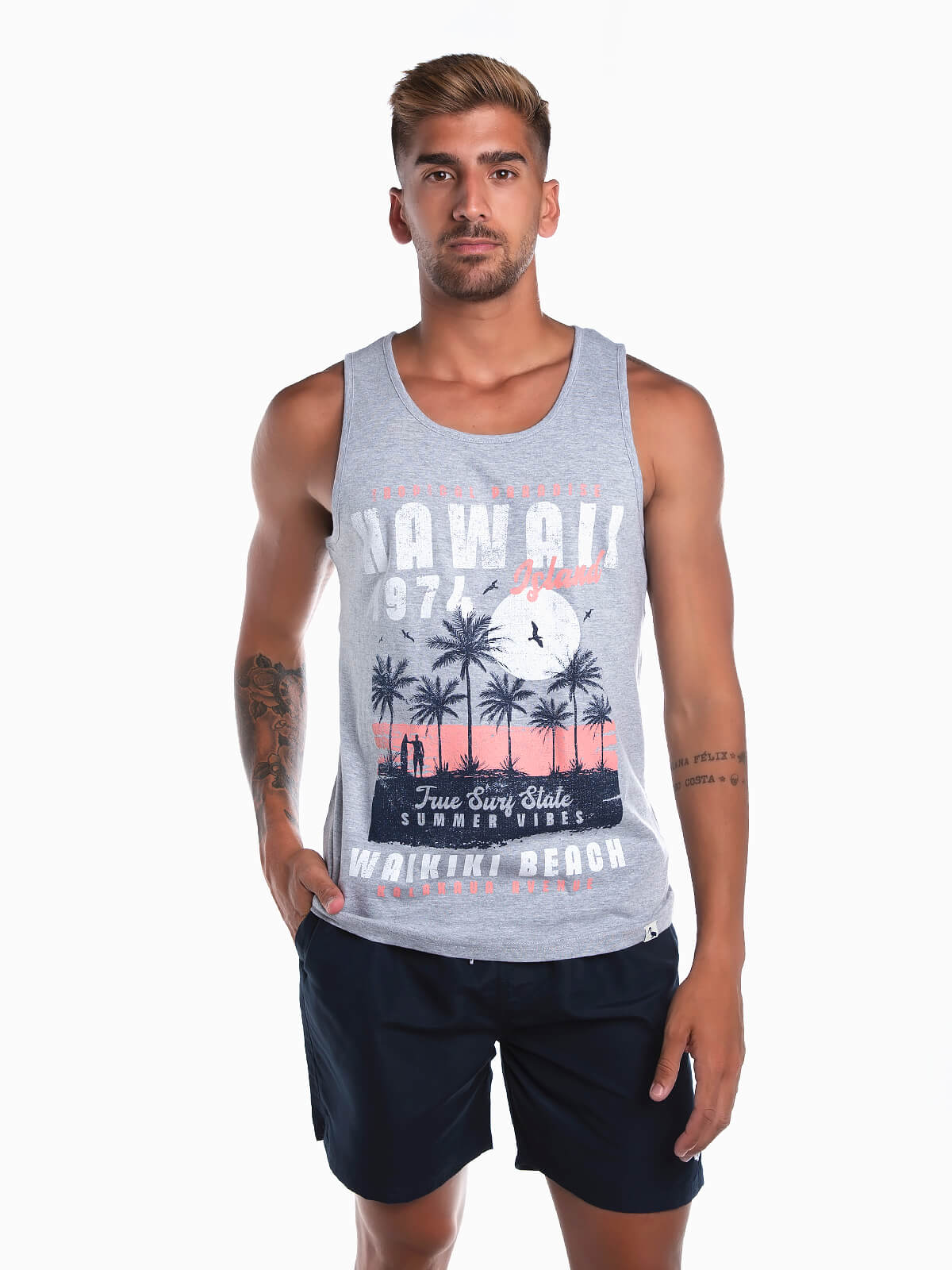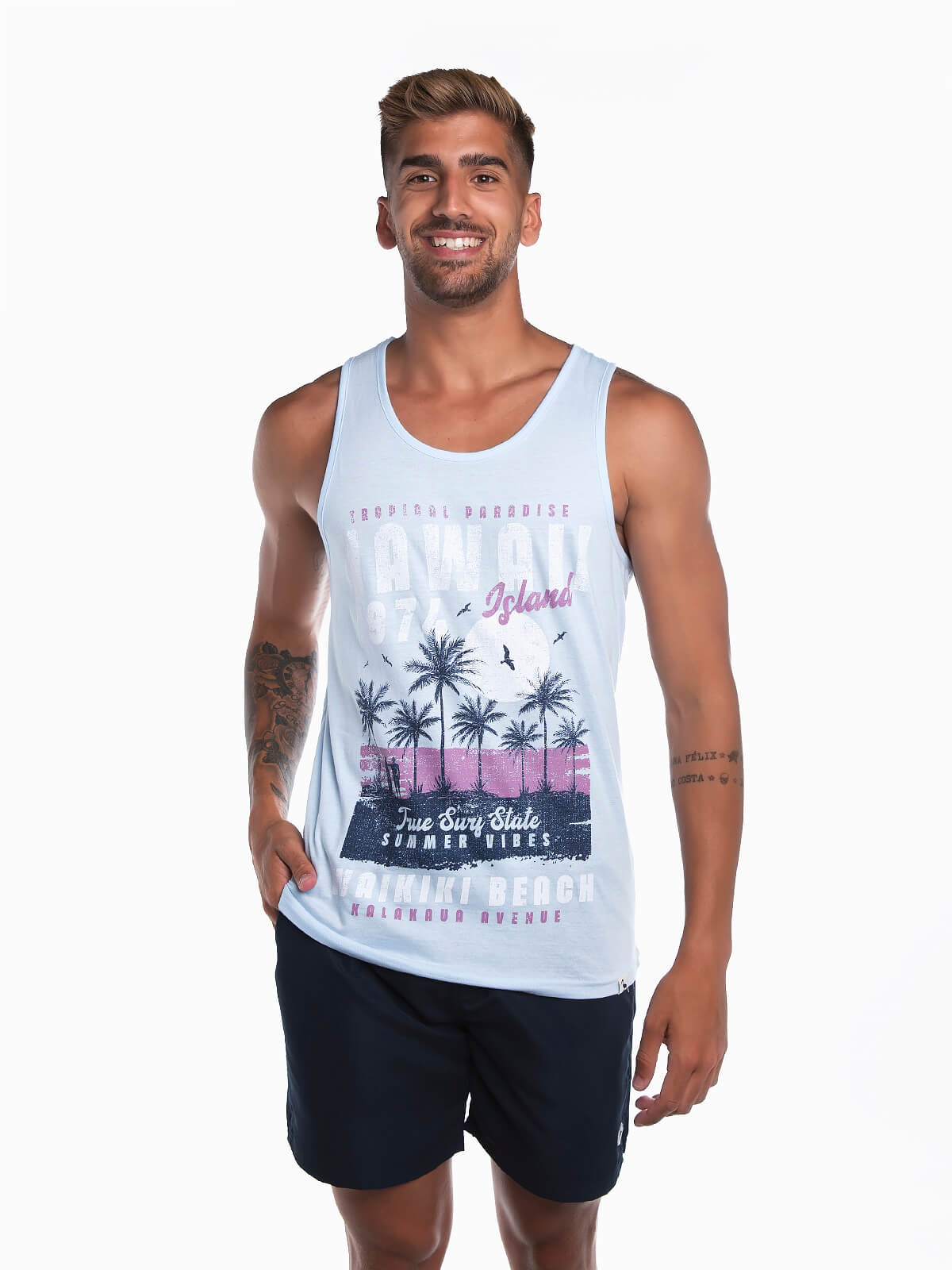 T-shirt de manga cava com estampado palmeiras para homem. T-shirt em tecido 100% algodão com gola redonda.