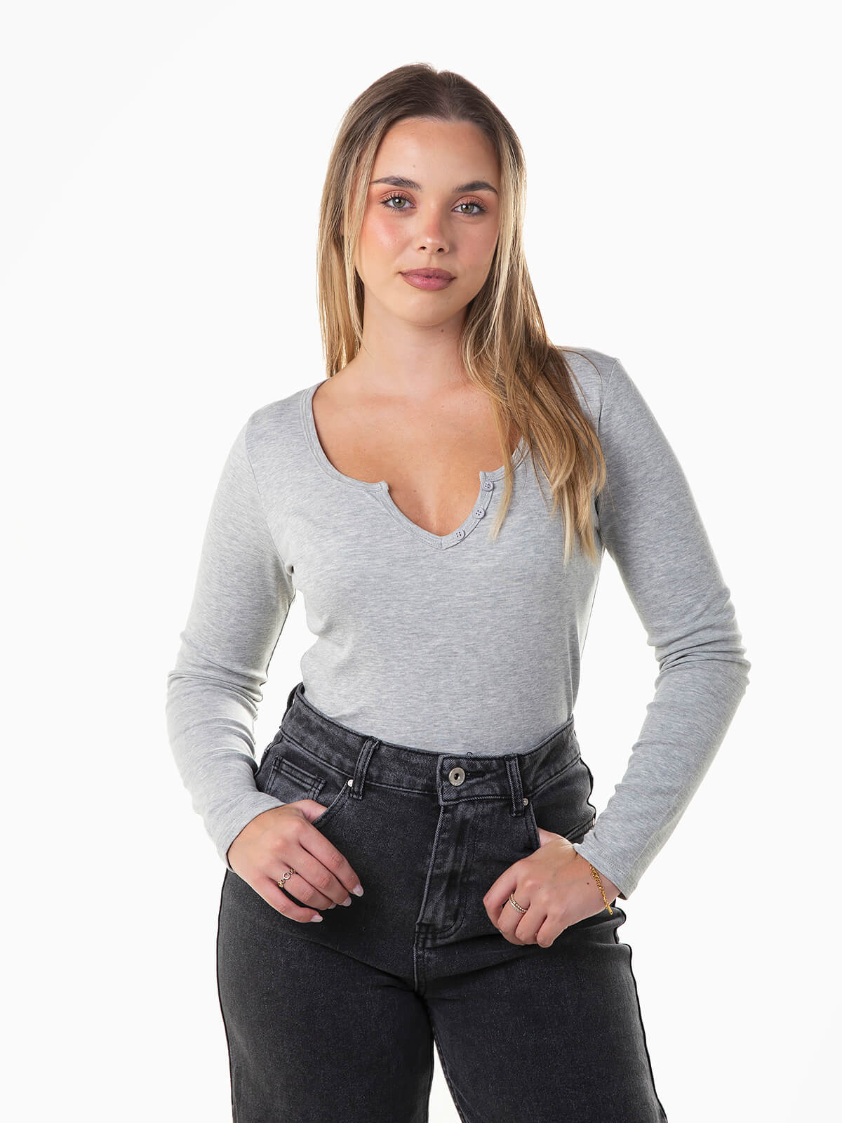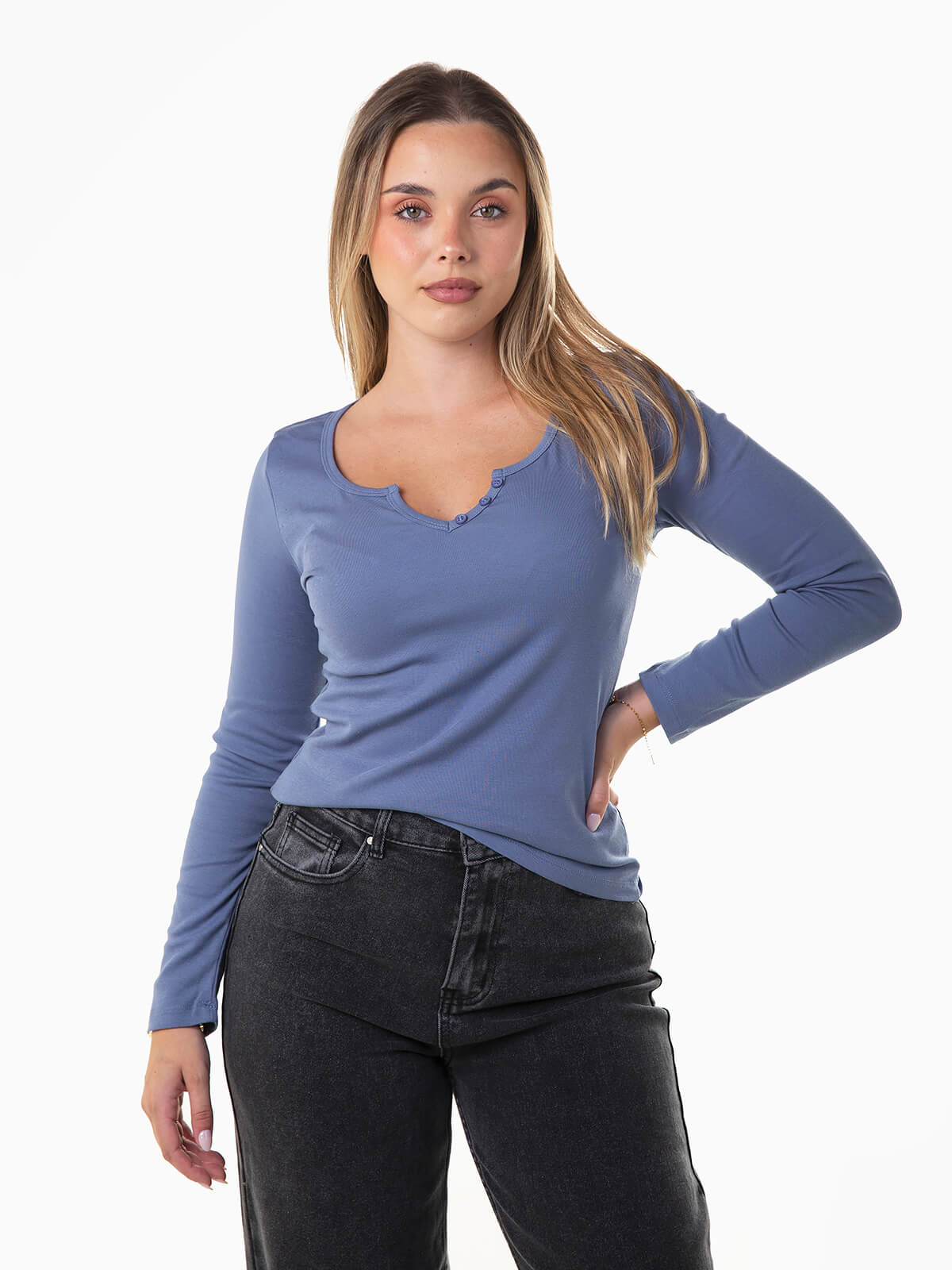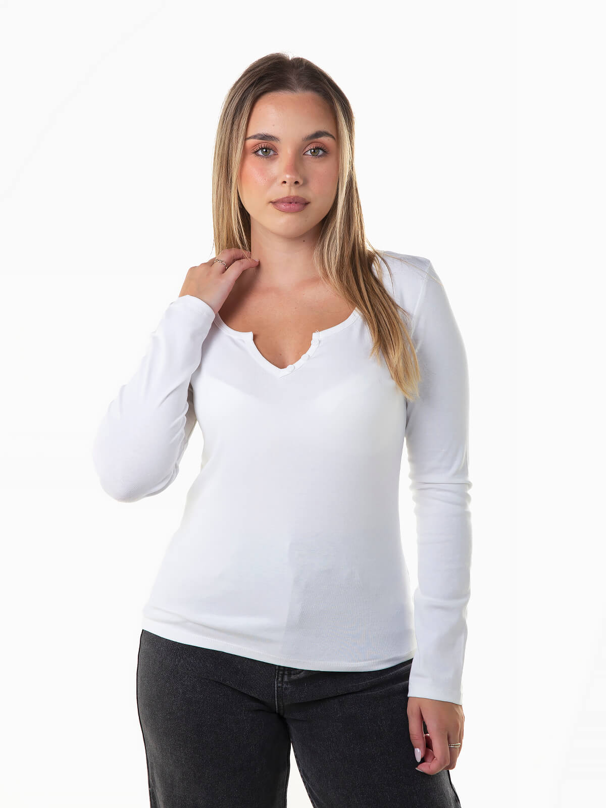 T-shirt de manga comprida com botões aplicados no decote. T-shirt justa elástica com decote redondo e abertura.