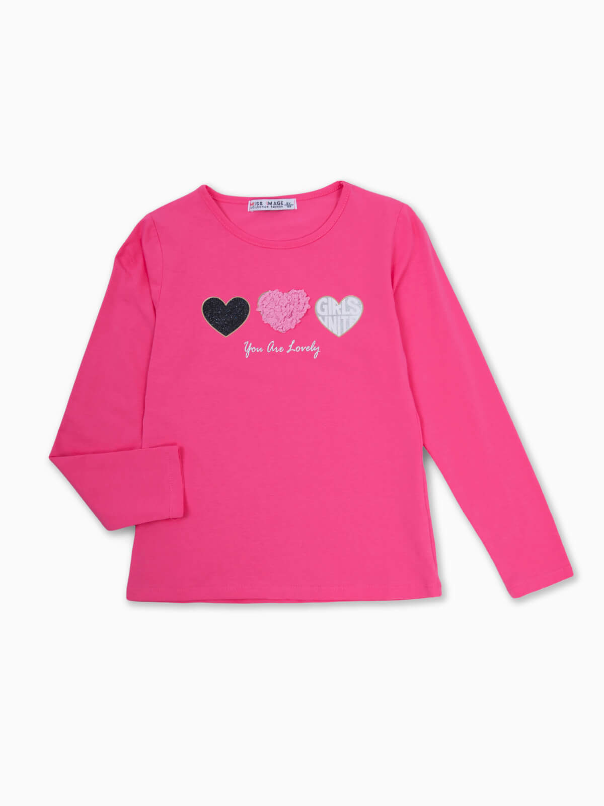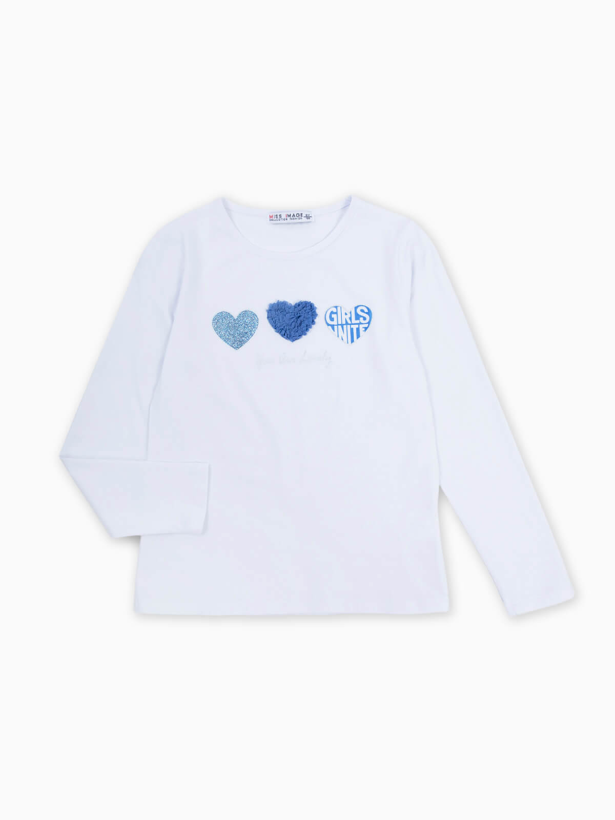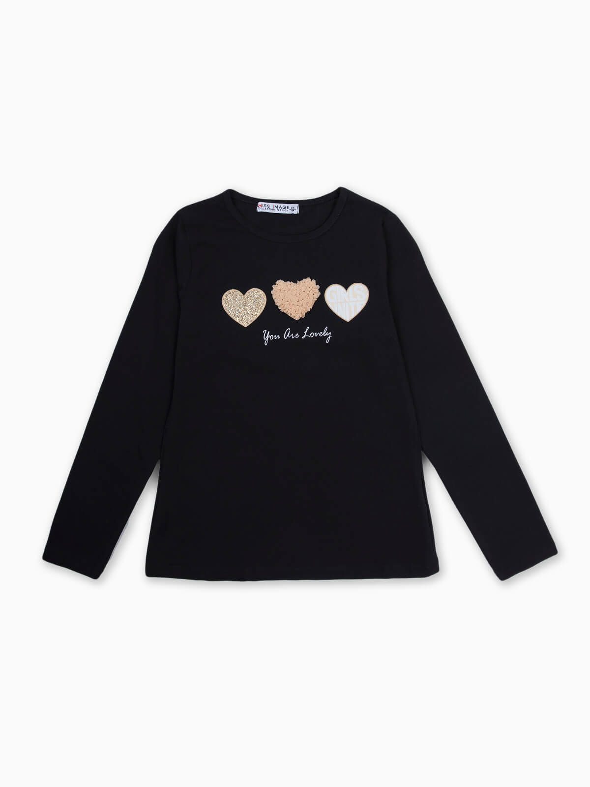 T-shirt de manga comprida com corações em relevo. T-shirt para menina com decote redondo.