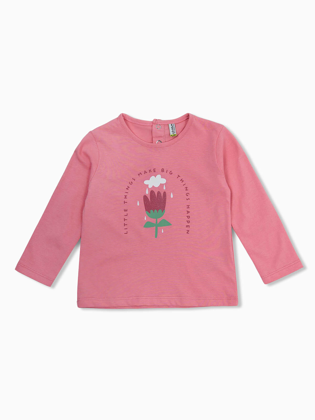 T-shirt manga comprida com flor estampada para bebé menina. T-shirt 100% algodão com decote redondo e aperto posterior botões de pressão.