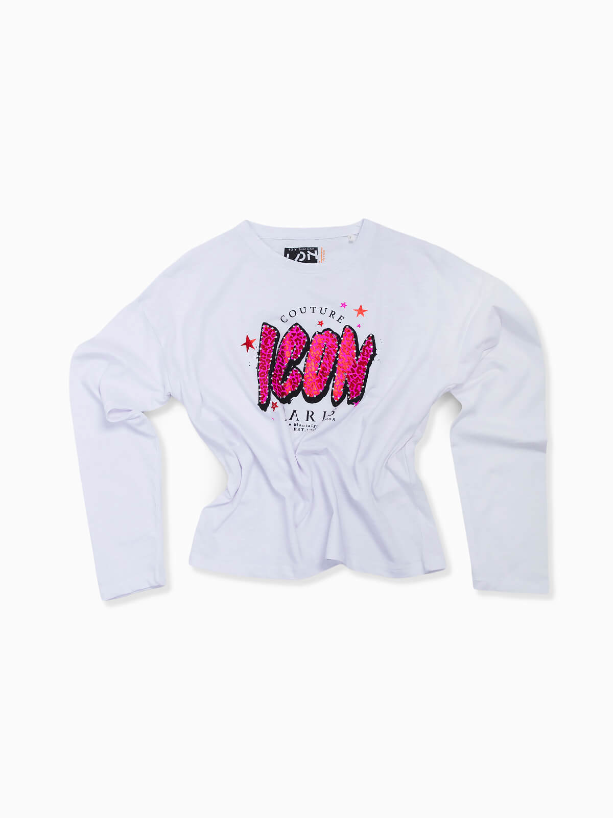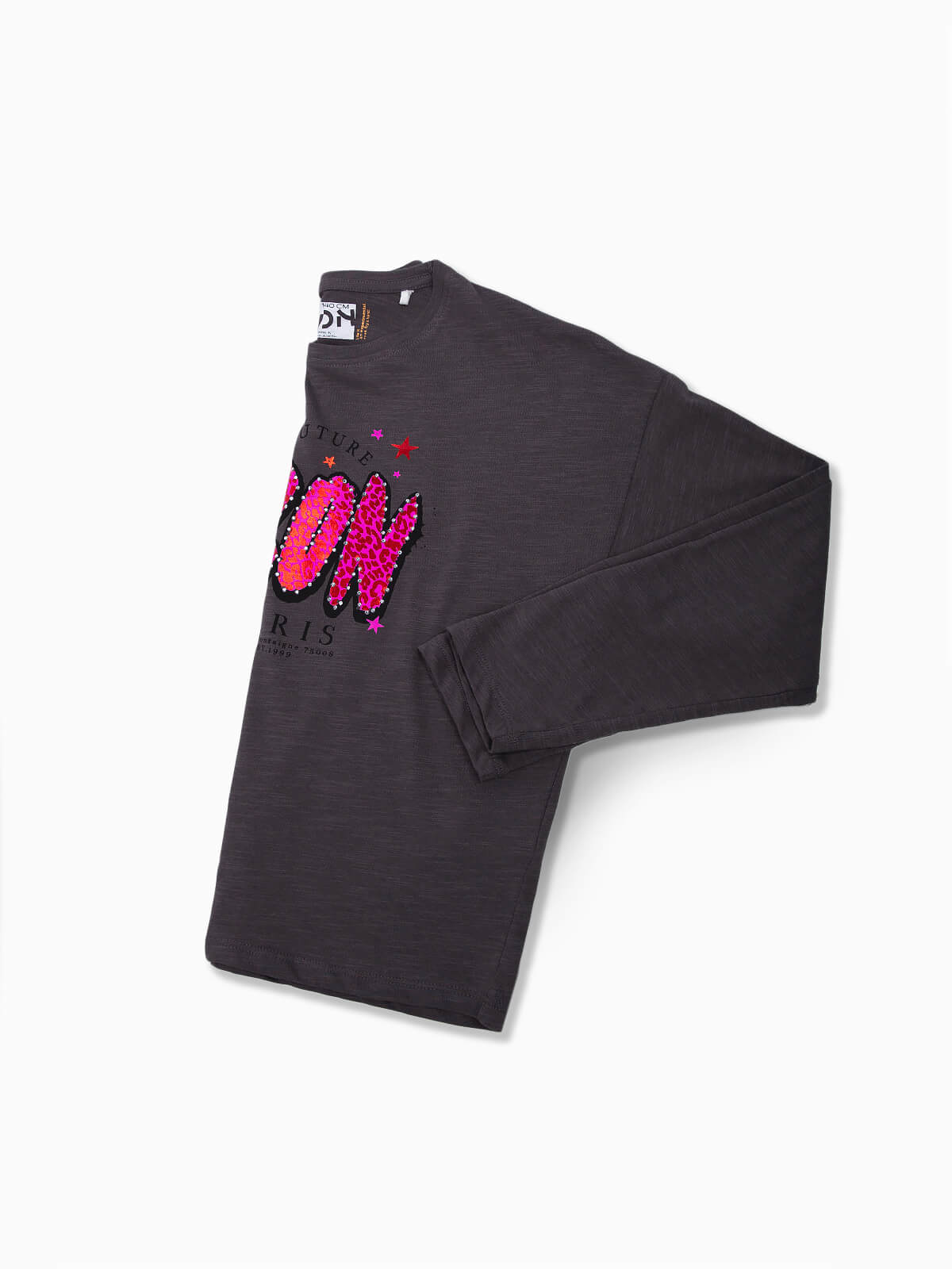 T-shirt de manga comprida com tachas aplicadas e animal print. T-shirt em tecido 100% algodão com decote redondo.