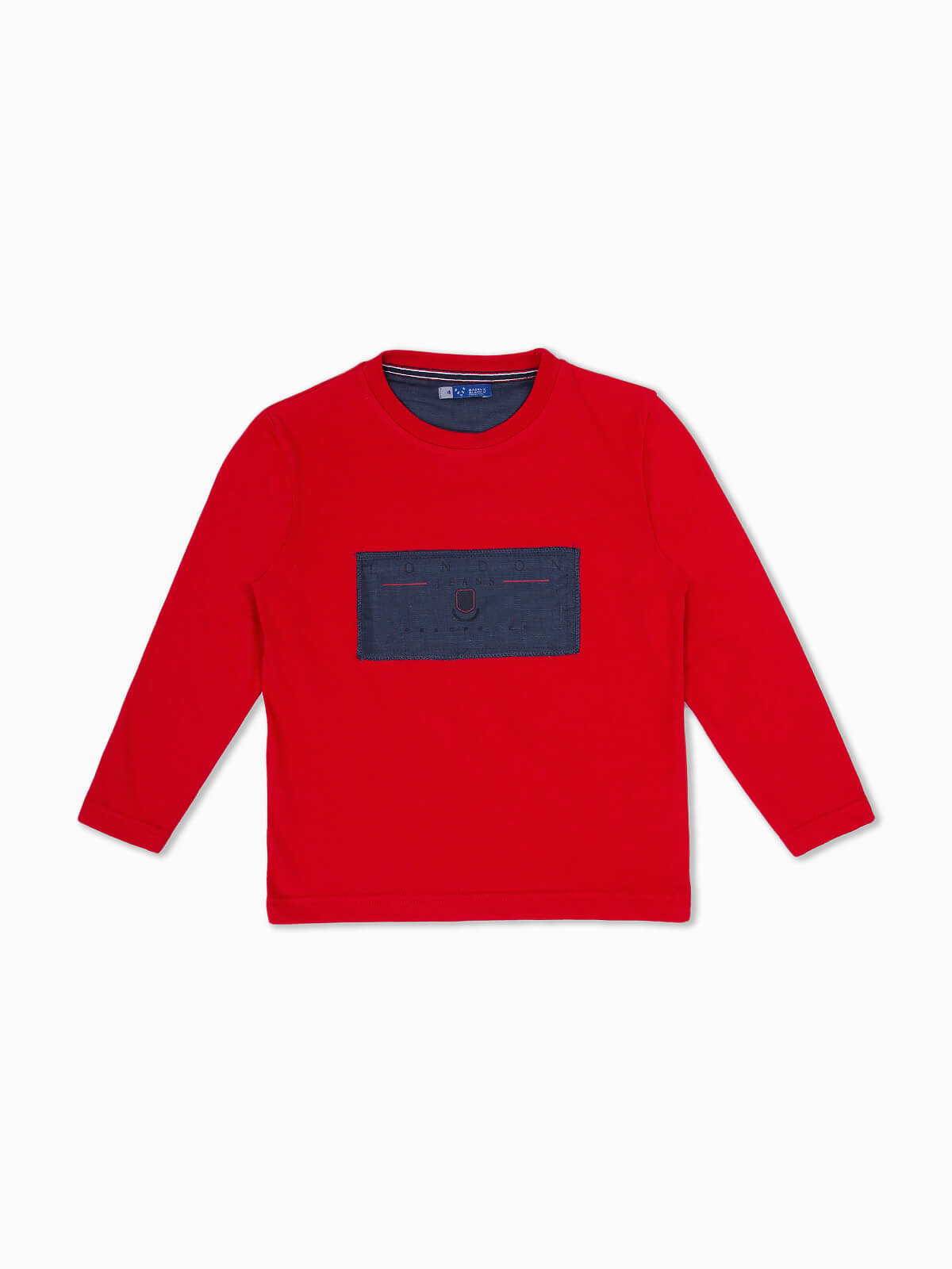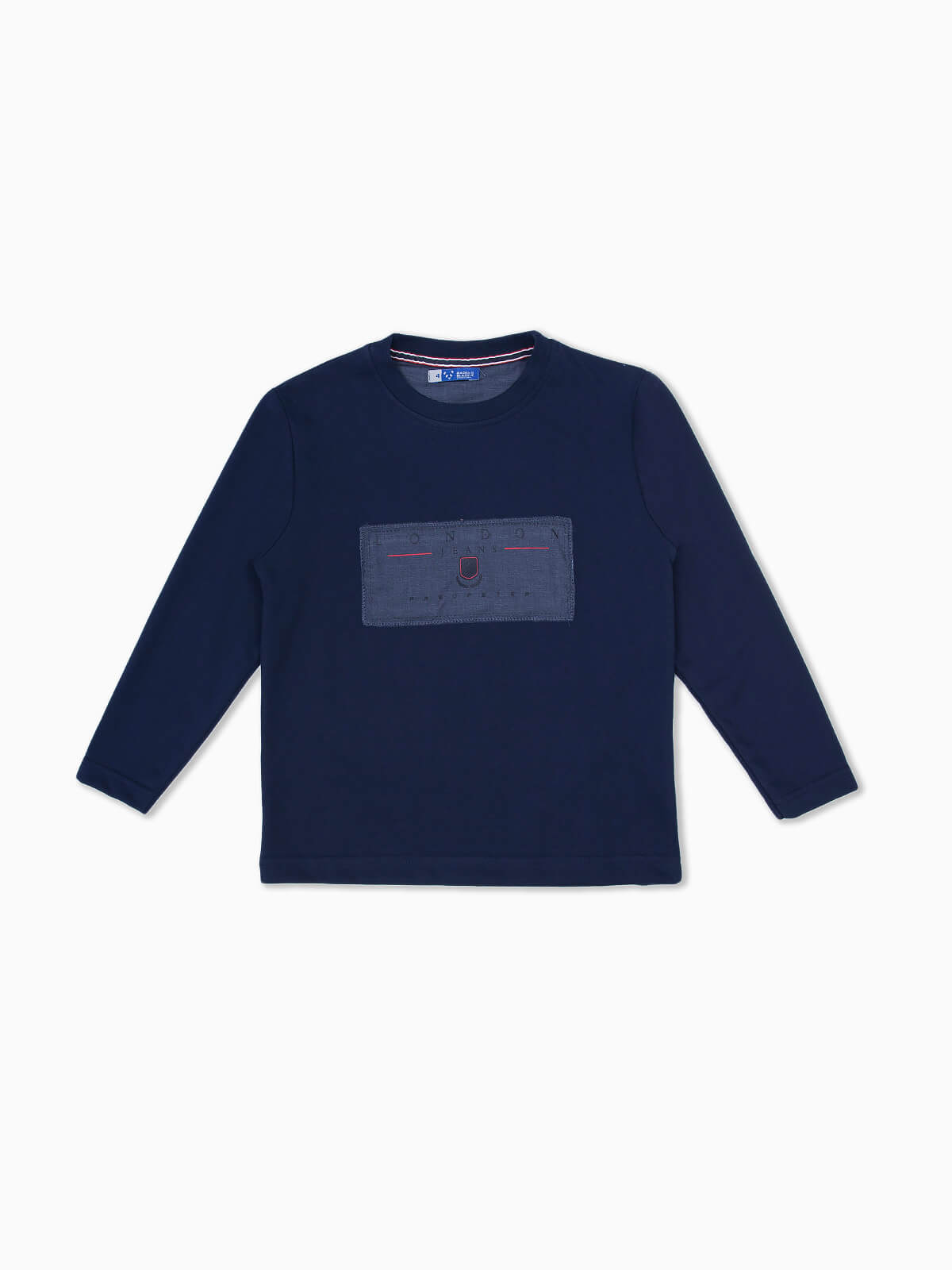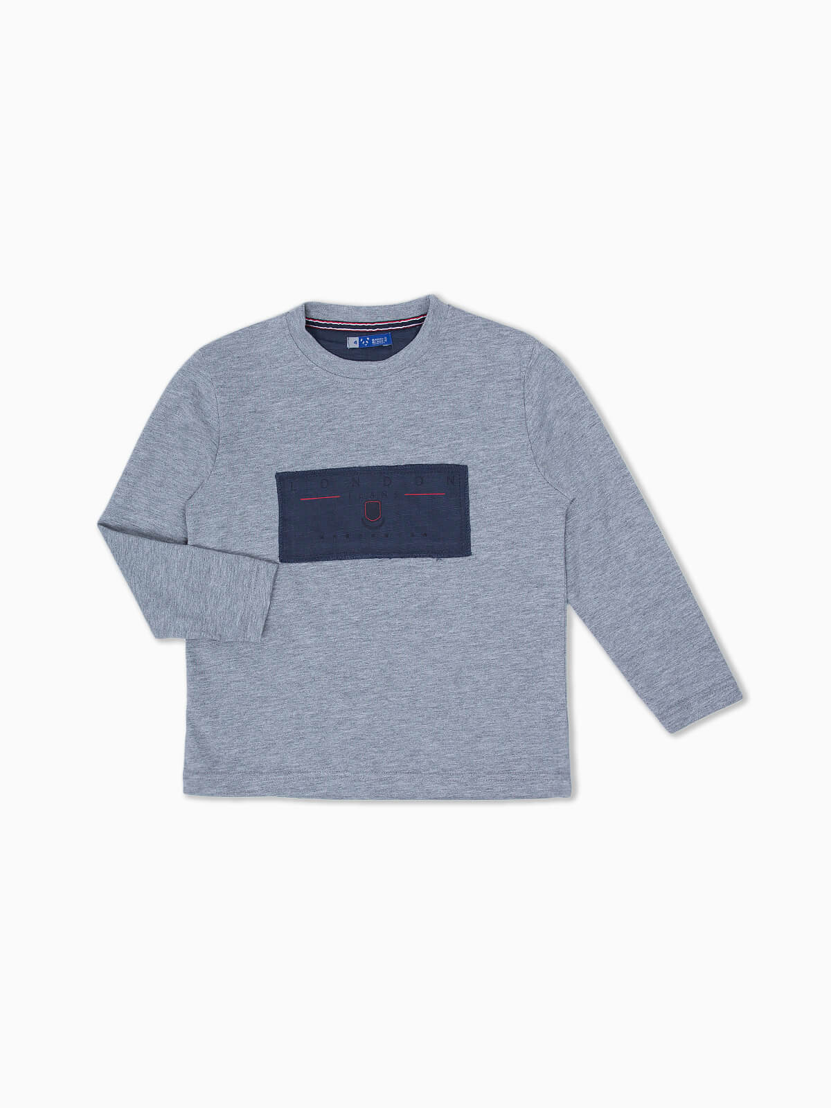 T-shirt de manga comprida com encaixe em ganga no peito. Gola redonda.
