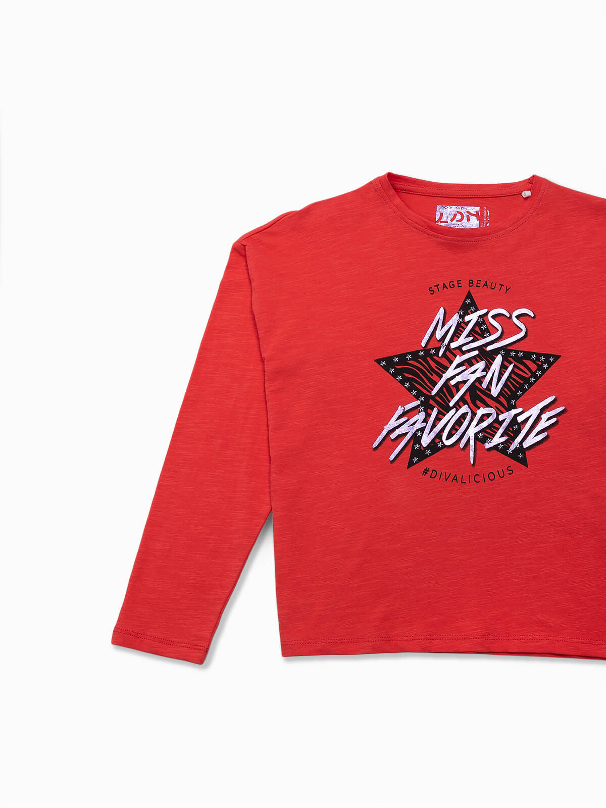 T-shirt de manga comprida com estampado de estrela animal print e letras. T-shirt em tecido 100% algodão com decote redondo.