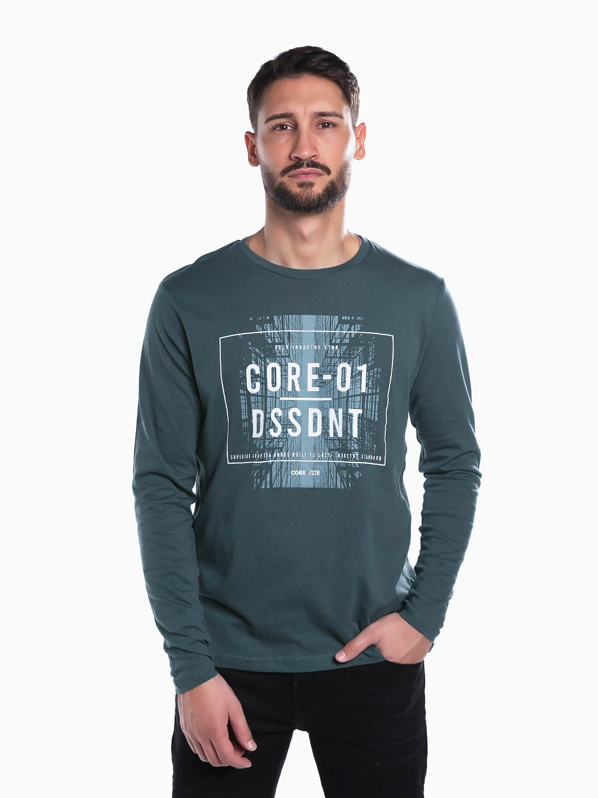 T-shirt de manga comprida com estampado de imagem e letras para homem. T-shirt em tecido 100% algodão. Gola redonda acabada em nervuras.