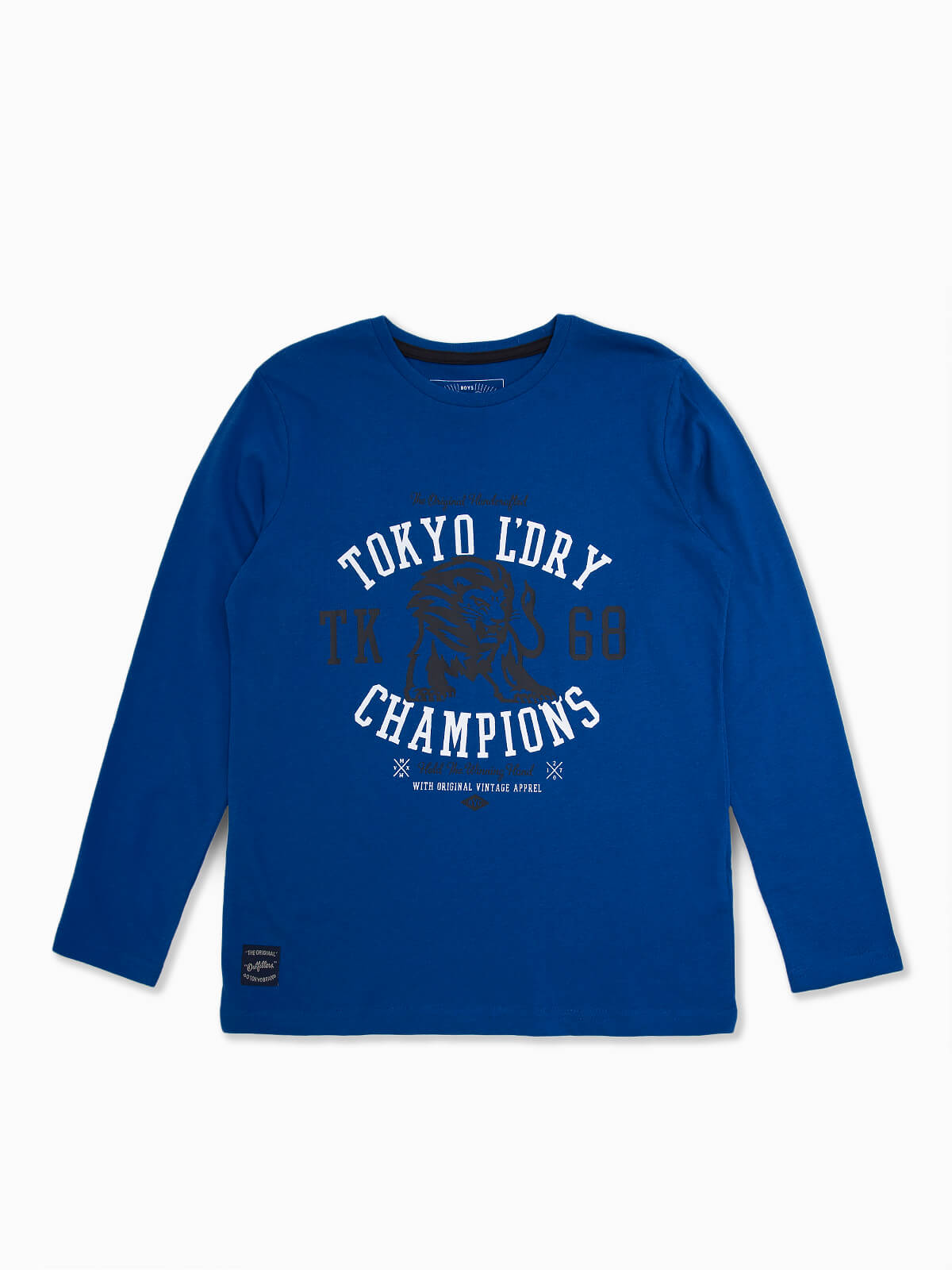 T-shirt de manga comprida com estampado de leão e letras no peito. T-shirt em tecido 100% algodão para menino com decote redondo.