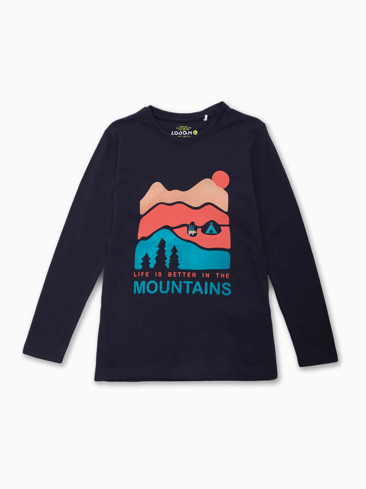 T-shirt de manga comprida com estampado de montanha para menino. T-shirt em tecido 100% algodão com gola redonda.
