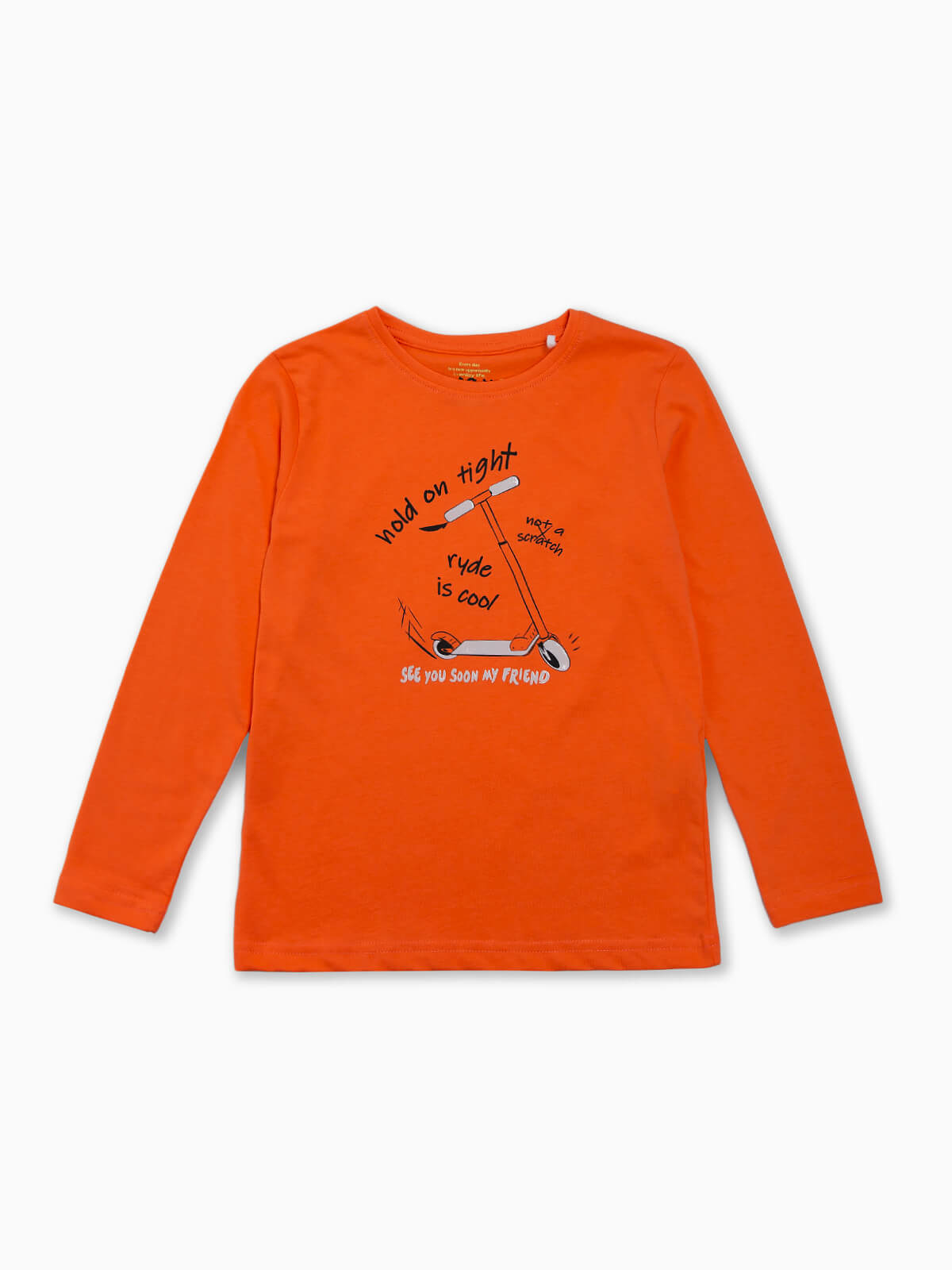 T-shirt de manga comprida com estampado de trotinete para menino. T-shirt em tecido 100% algodão com gola redonda.