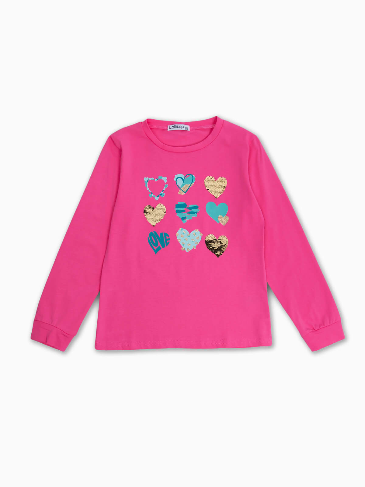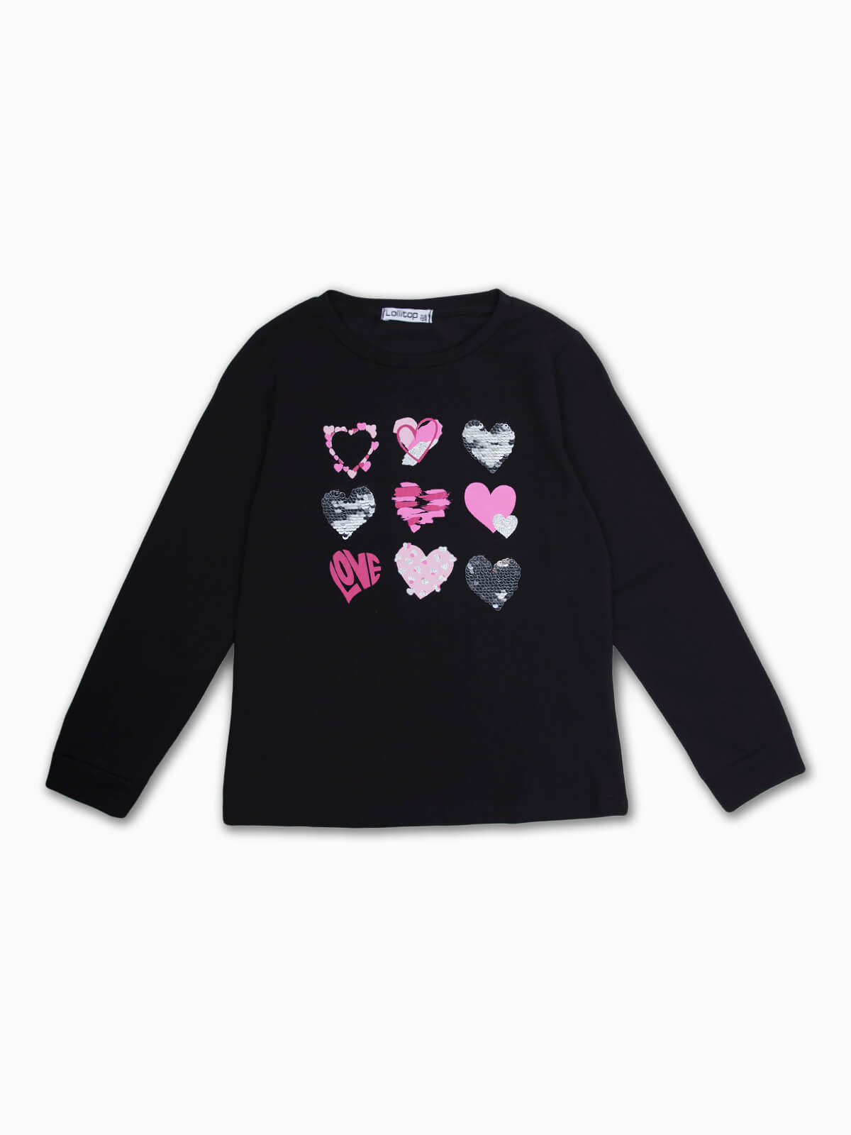 T-shirt de manga comprida com corações em lantejoulas e brilhantes. T-shirt para menina com decote redondo.