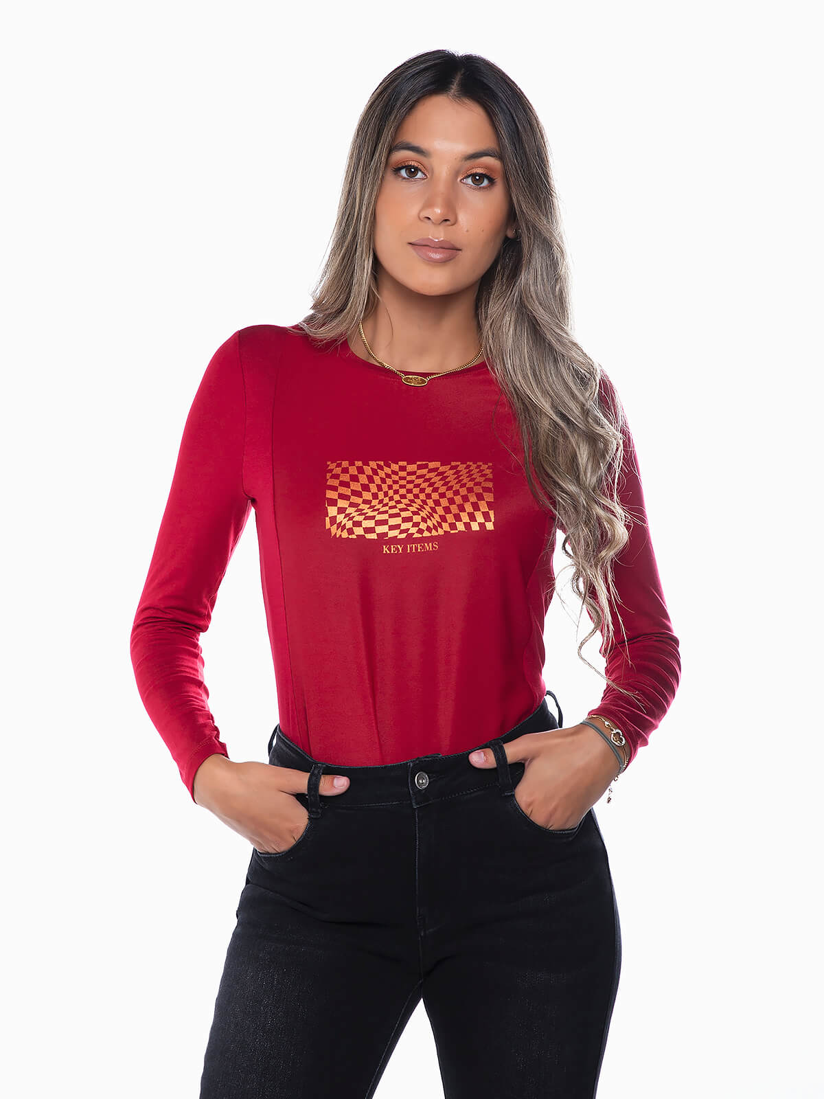 T-shirt manga comprida com malha crepe na frente. Manga comprida. Decote redondo.