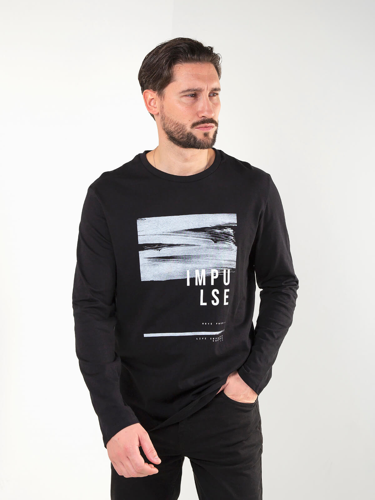 T-shirt manga comprida preta, em algodão, com imagem estampada e gola redonda. Modelo confortável e versátil para looks casuais.