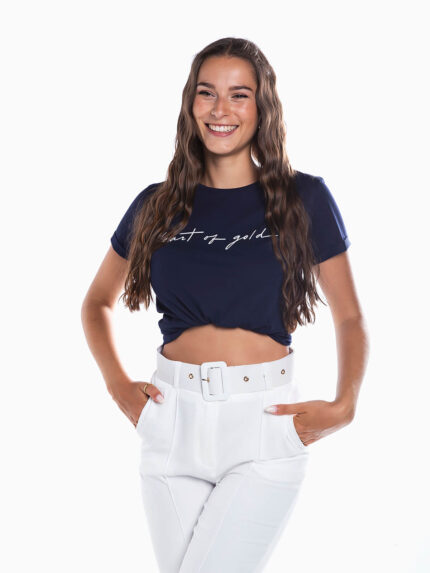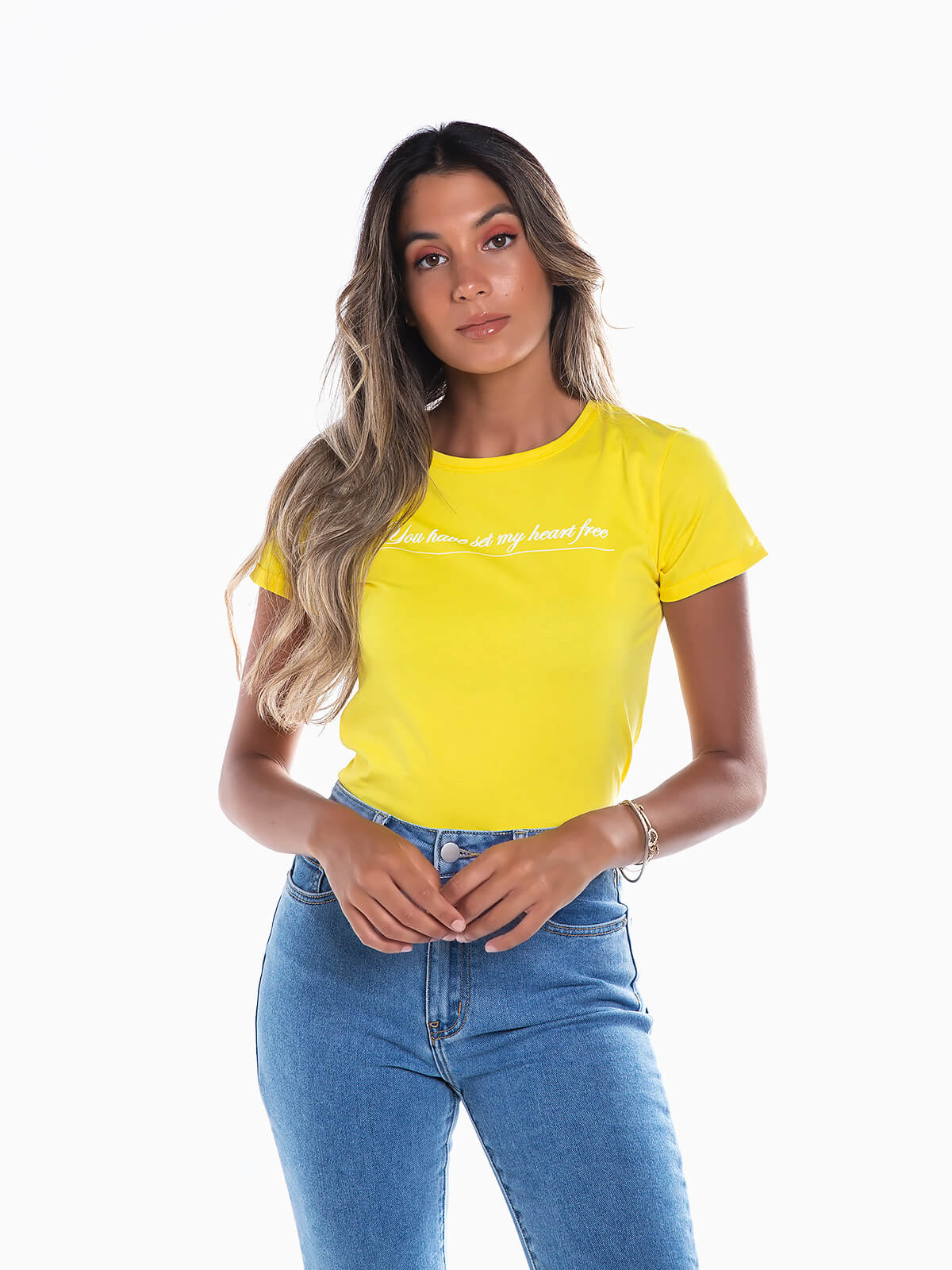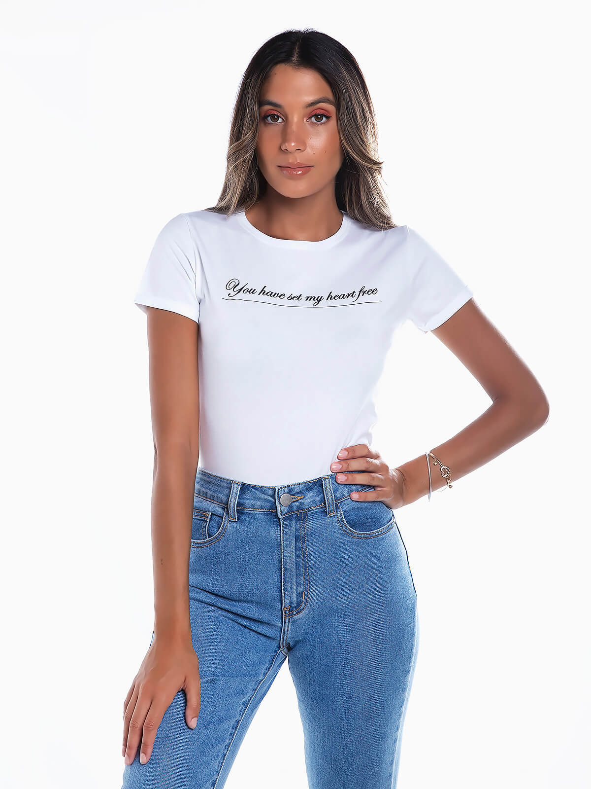 T-shirt de manga curta dobrada em tecido 100% algodão para senhora. T-shirt com frase estampada e decote redondo.