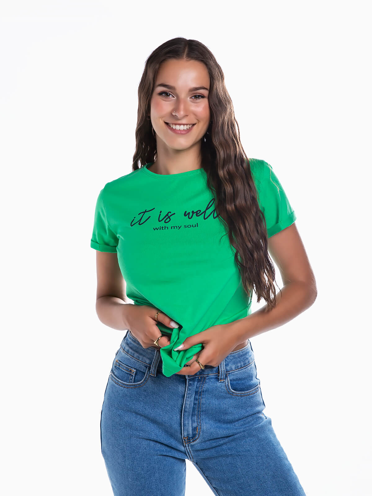 T-shirt de manga curta dobrada em tecido 100% algodão. T-shirt com estampado de letras. Gola redonda.