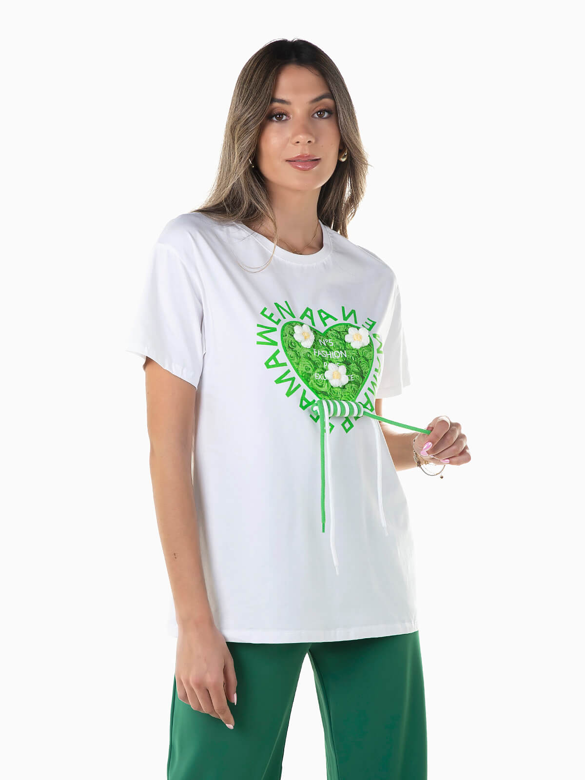 T-shirt manga curta com coração estampado e decote redondo. T-shirt para senhora com aplicação de cordão e flores em crochet.