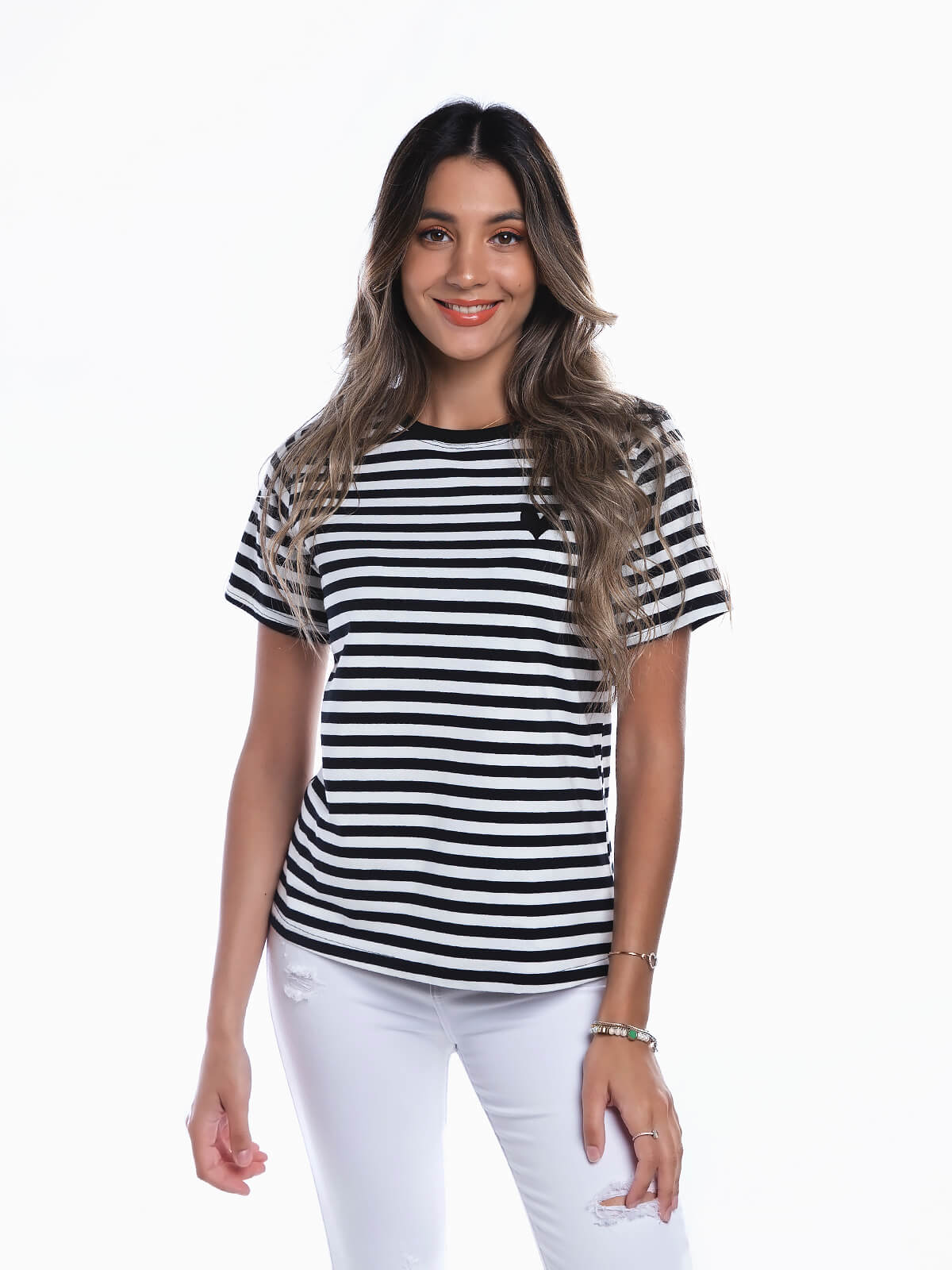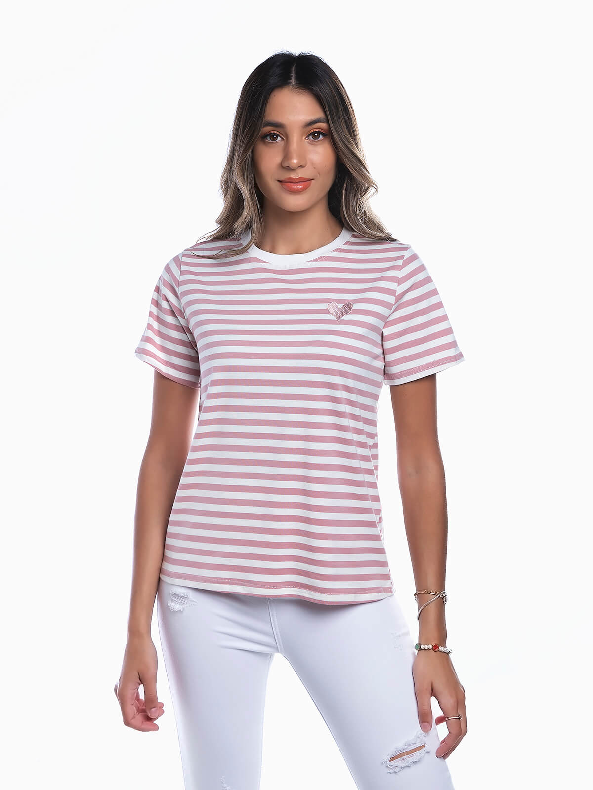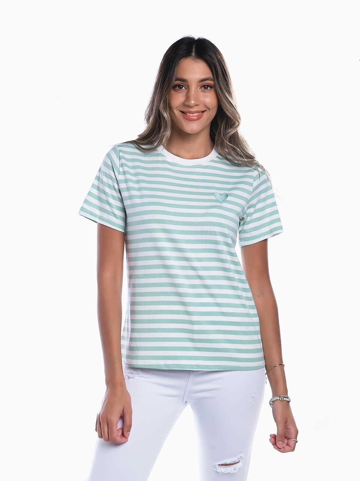 T-shirt de manga curta às riscas com coração bordado no peito. T-shirt com decote redondo.