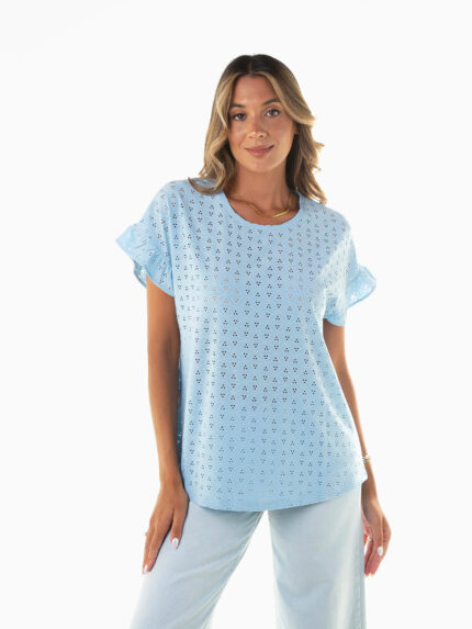 T-shirt de malha canelada com corte assimétrico e botões chapa decorativos à frente. Decote redondo e mangas curta, perfeita para looks casuais modernos. Combina com calças de cintura alta ou saias fluidas para um outfit descontraído e atual.
