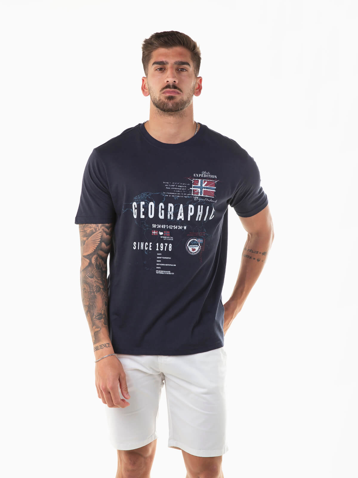 T-shirt azul marinho de manga curta com estampado no peito. T-shirt 100% algodão para homem com gola redonda.