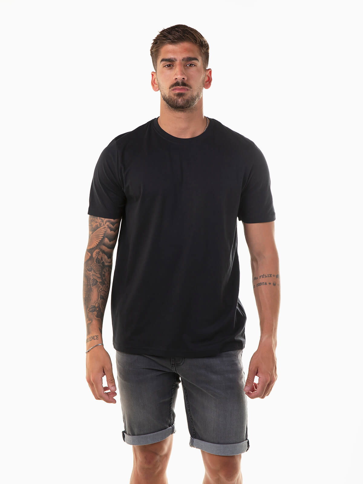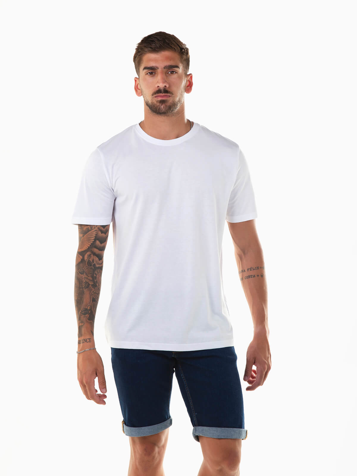 T-shirt básica de manga curta para homem. Com um corte confortável e gola redonda, é ideal para usar sozinha ou como camada base por baixo de camisas, malhas ou casacos. Uma peça essencial no guarda-roupa masculino, versátil e fácil de combinar com qualquer look.