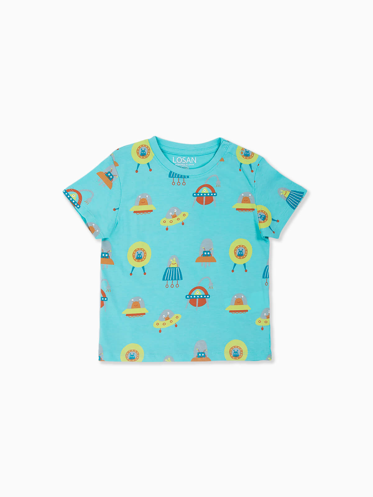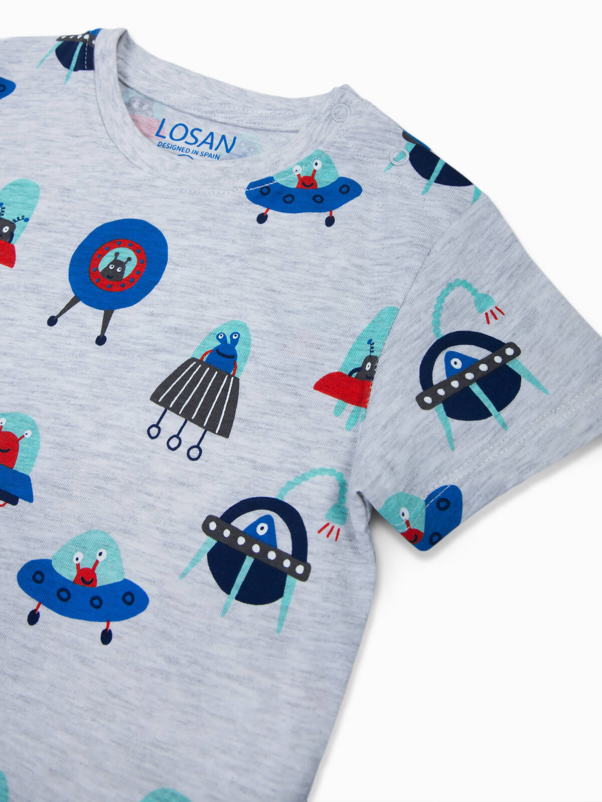 T-shirt de manga curta para bebé menino. T-shirt com motivos estampados de gola redonda. Aperto de 2 botões de pressão.
