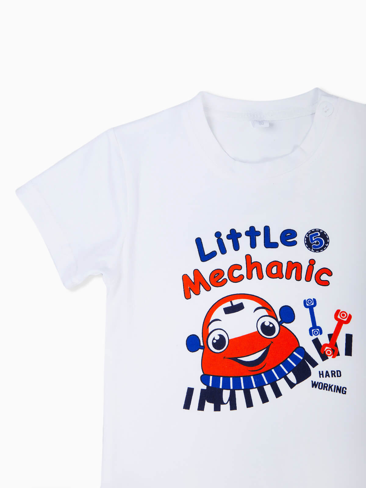 T-shirt de manga curta para bebé menino com motivos estampados. T-shirt de gola redonda com aperto de 2 botões.
