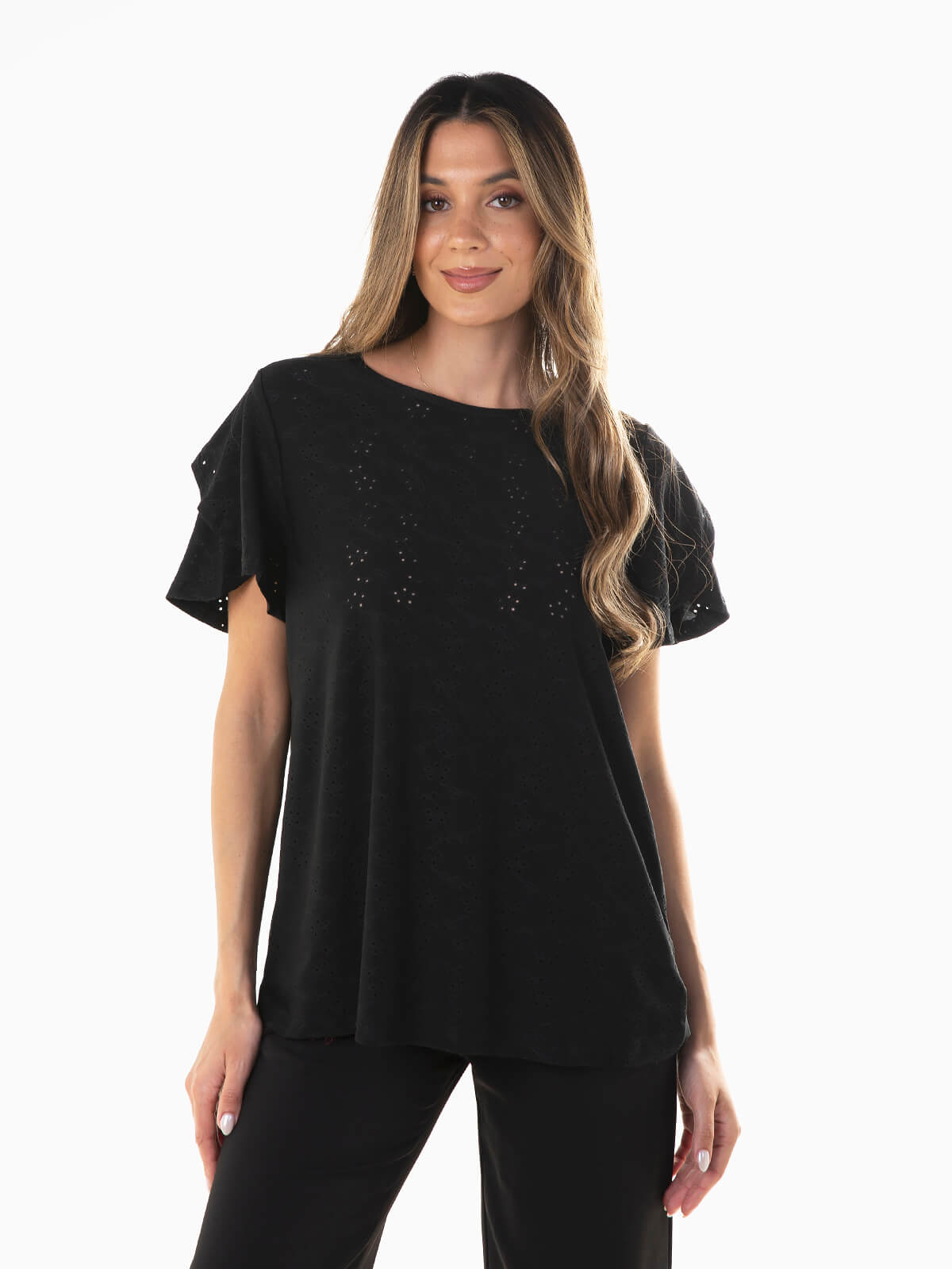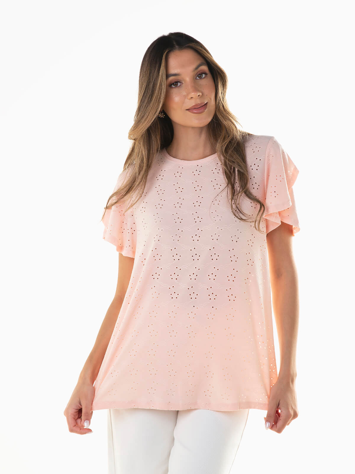 T-shirt de manga curta bordado inglês para senhora. T-shirt para mulher com decote redondo.