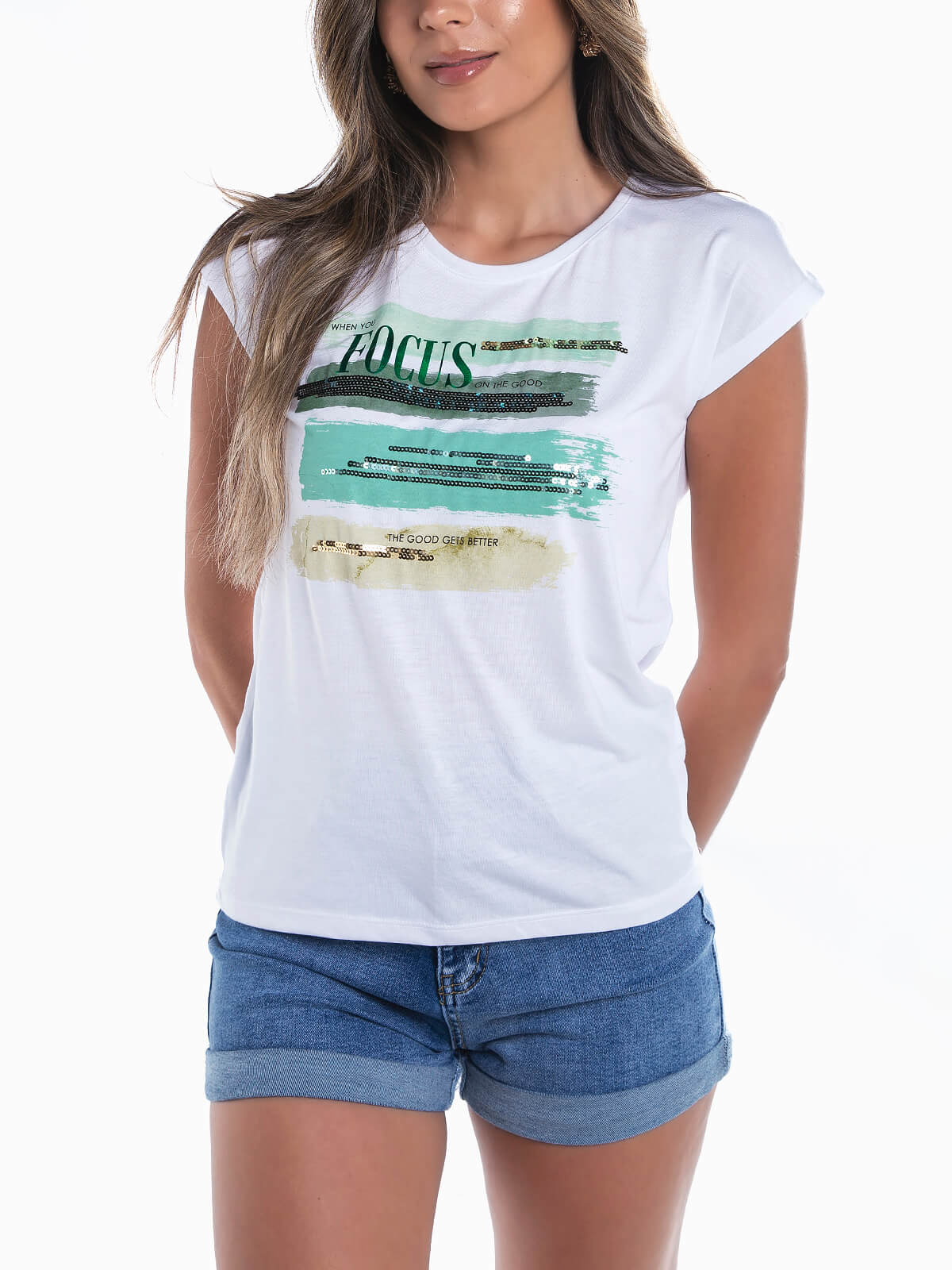 T-shirt de manga curta branca com estampado e lantejoulas no peito. T-shirt para senhora com decote redondo.