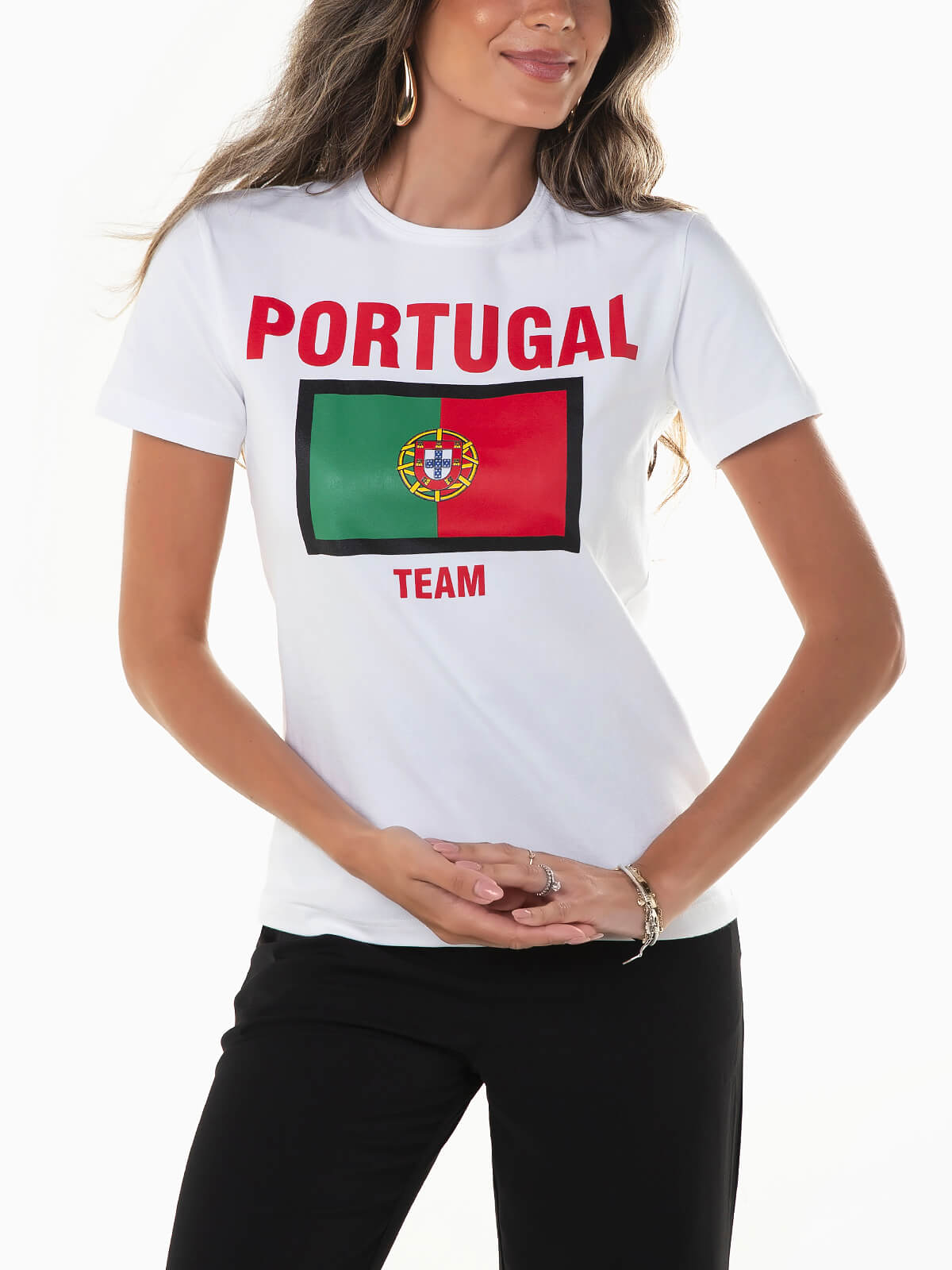 T-shirt branca de manga curta com estampado alusivo à seleção portuguesa. T-shirt para senhora com decote redondo.